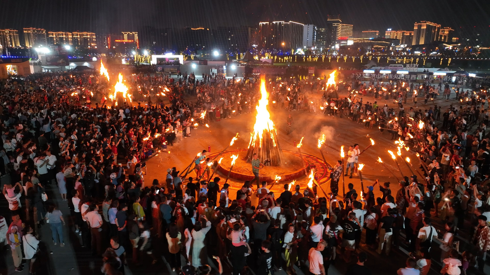 火把打起来,篝火燃起来!市民和游客随着音乐欢呼、拍手、踢脚,无论相识与否都牵手共跳达体舞,共享彝族风情狂欢盛宴。