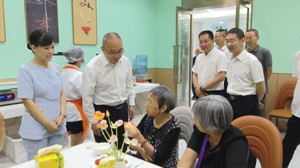 绵阳市卫健委党委委员、副主任田卫(左二)与前来参加健康体检的老人交谈,老人参加体检后在营养餐厅免费用餐