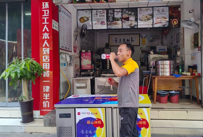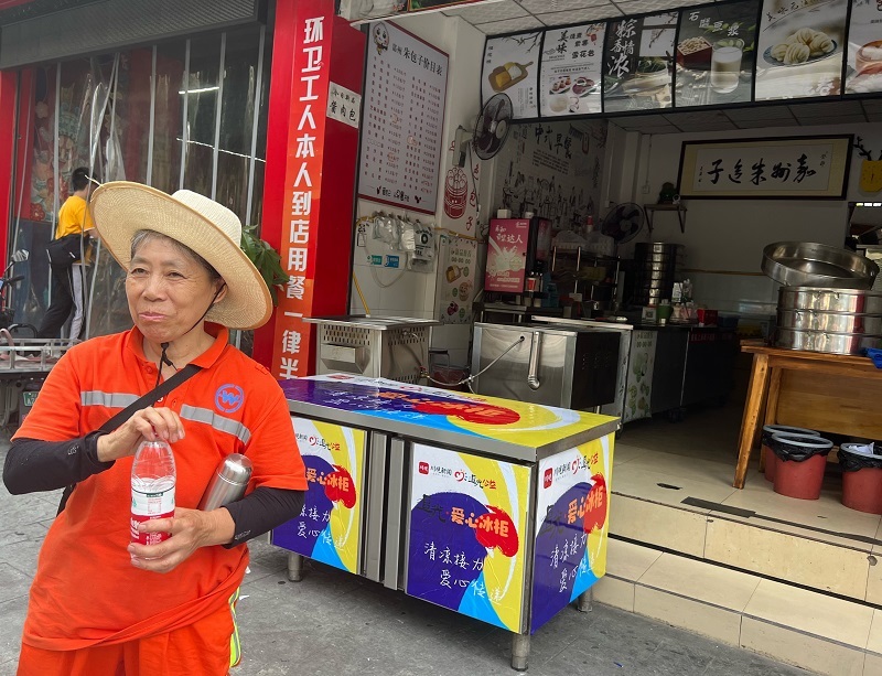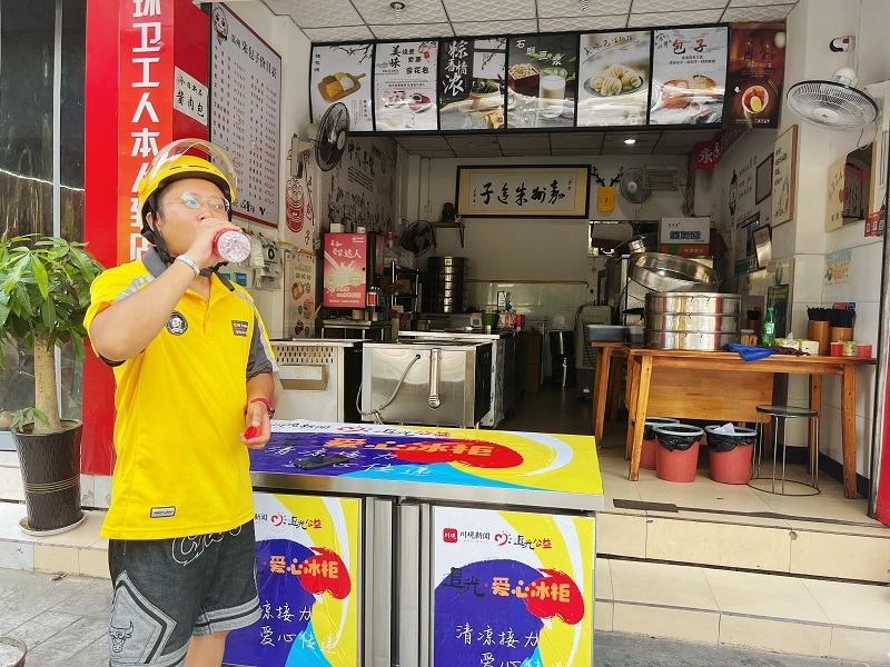“早就听说这里有家包子铺对环卫工人实行早餐半价优惠,没想到今天又联合川观新闻为我们增设‘爱心冰柜’,想得太周到了!”外卖员王柯激动地竖起大拇指说,随着气温升高,每天都要喝好几瓶水,忙的时候没时间买水,渴了只有忍着。有了这个“爱心冰柜”,再忙也能喝上一口冷饮,他要将“爱心冰柜”广而告之。