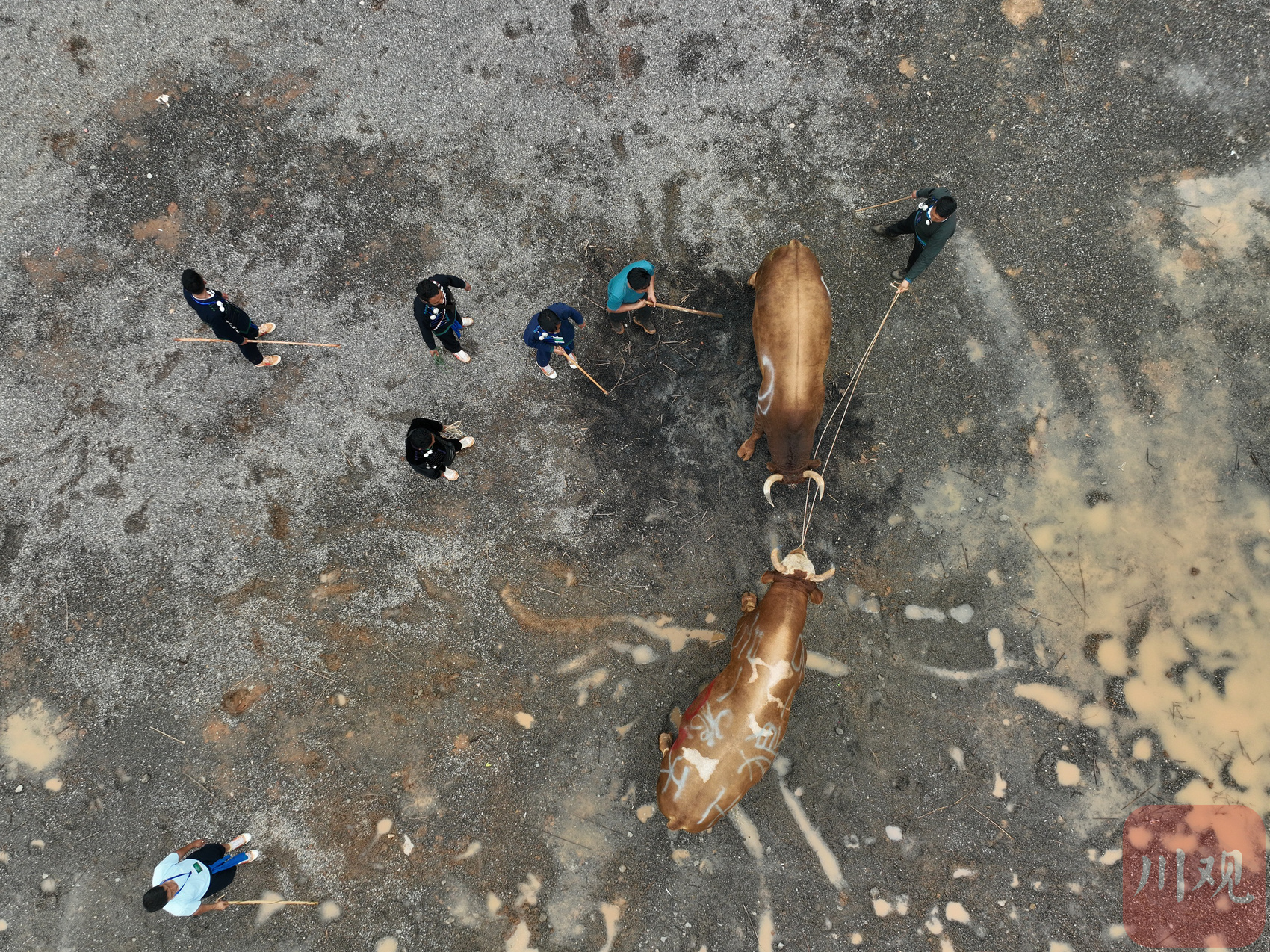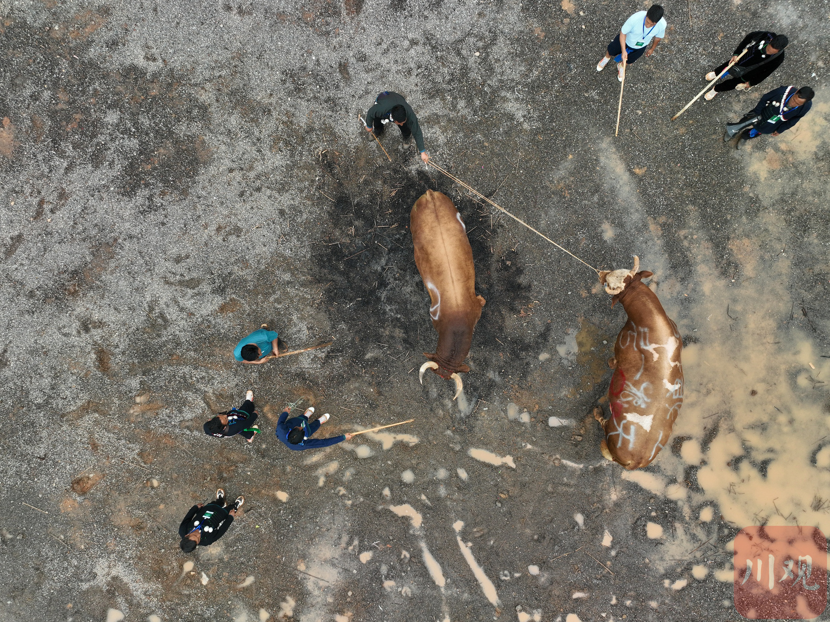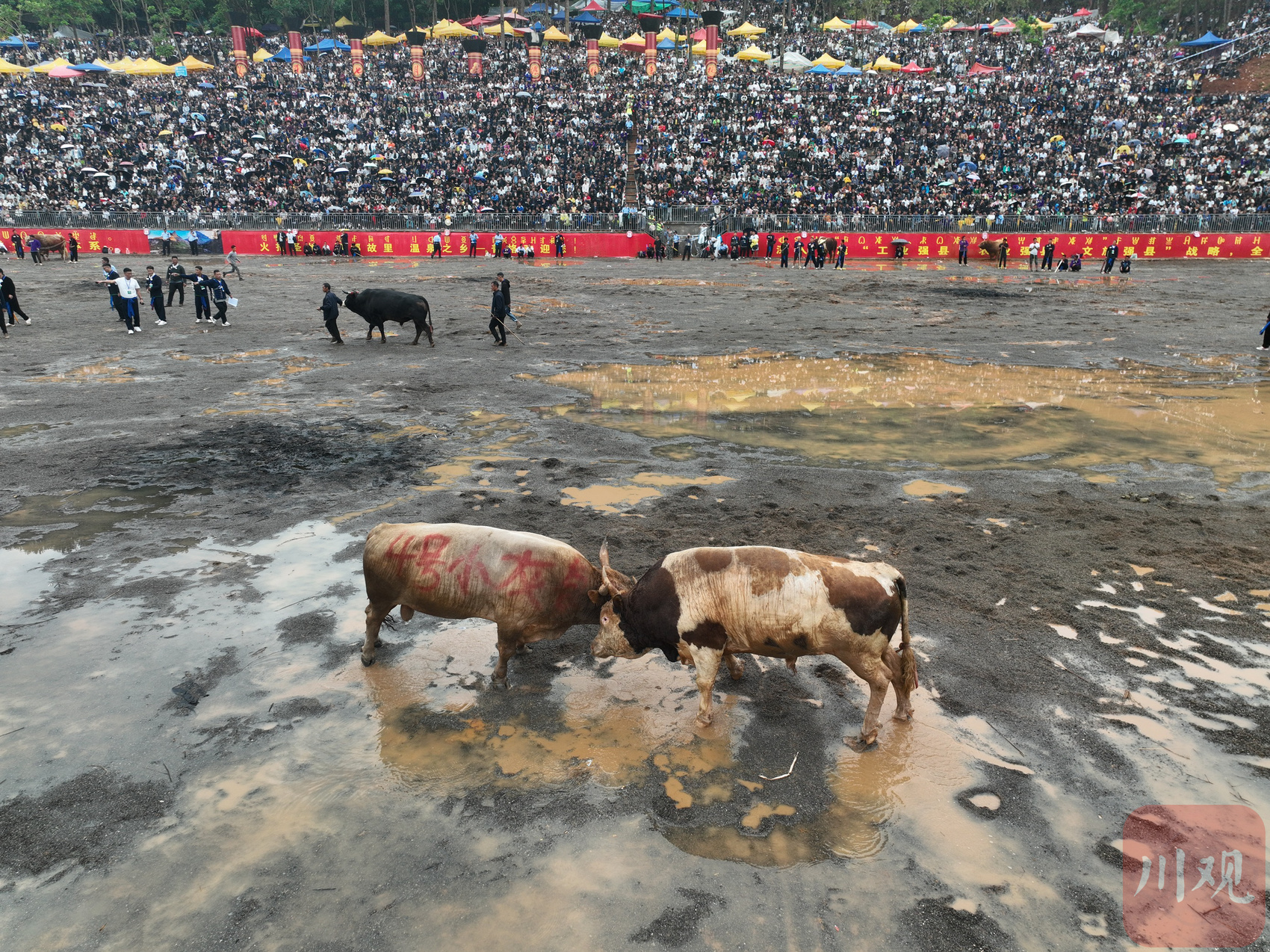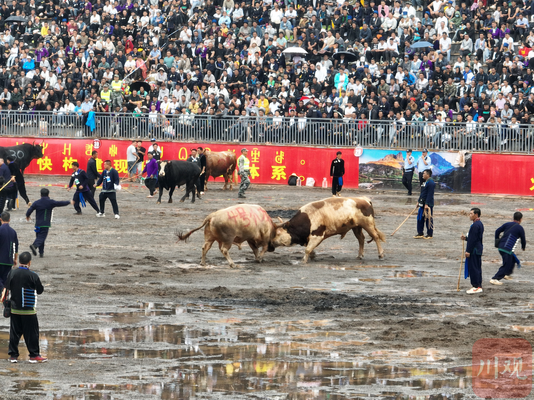 “王中王”“扛把子”……这些牛的身上不仅喷绘了序号,有的还喷绘了牛主人为它们取的名字。“我是普格县西洛镇人,我给这头牛取了一个很响亮的名字,叫‘火箭一号’。”休息间隙,参赛者解乃日拉告诉记者,他这头牛以前也参加过多次斗牛比赛,不仅身强力壮,耐力也很好。