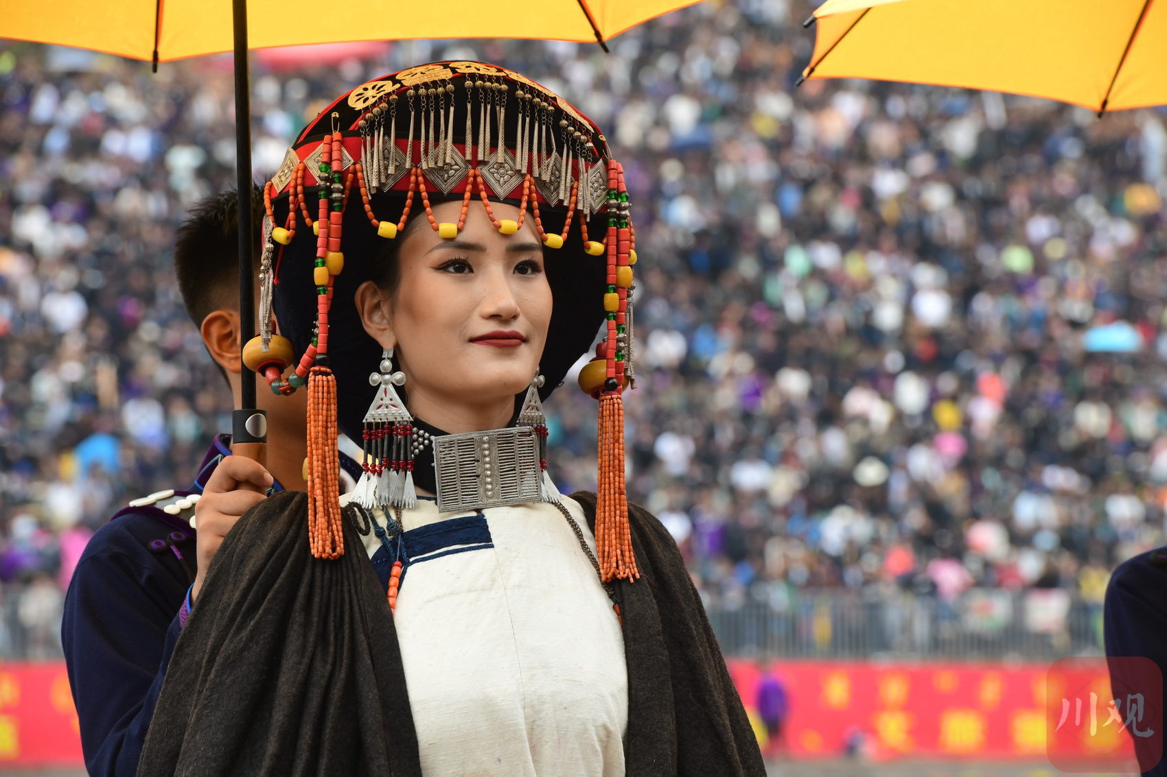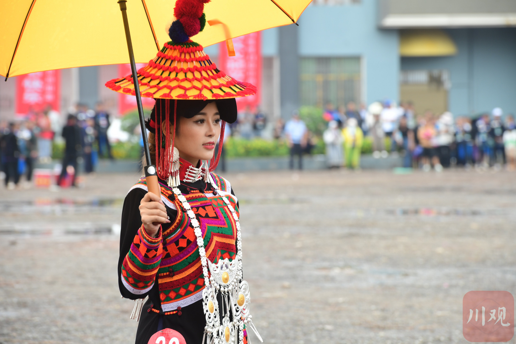 在经过朵洛荷彝族服饰展示和个人才艺展示等环节后,25名选手身着彝族盛装、手持黄伞,面带笑容,摇曳着婀娜多姿的身材,来到火把文化中心,用自信、大方、美丽展现着新时代彝家女孩的风采。