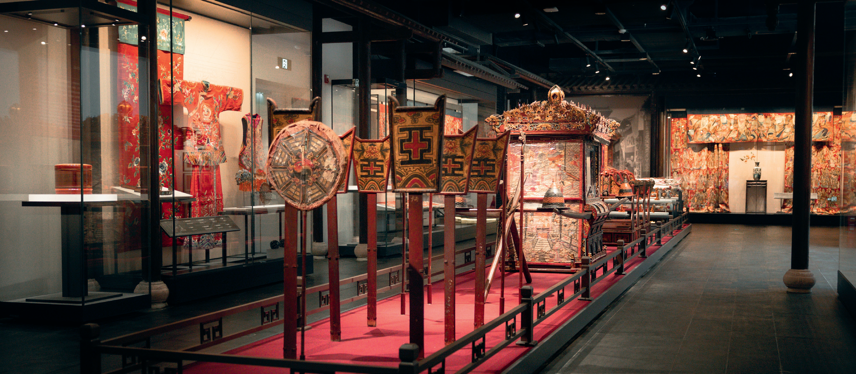 这是四川大学博物馆的网红文物之一。来自成都上世纪三四十年代鸿发号轿行的一整套婚嫁行头,再现了当年婚嫁的喜庆场景。据介绍,鸿发号轿行是成都草市街一家颇具规模的轿行。这里出租成都人娶亲需要的一切物品:开路的仪仗、迎新的花轿、吹打的鼓乐、纳礼的抬盒、房屋各处红彩软缎的装饰,甚至新人的凤冠霞帔、鞋履玉带、珠串盖头,一应俱全,类似于今天的婚庆公司。如今,这些行头不仅被博物馆收藏,甚至当年的礼单也留存至今。