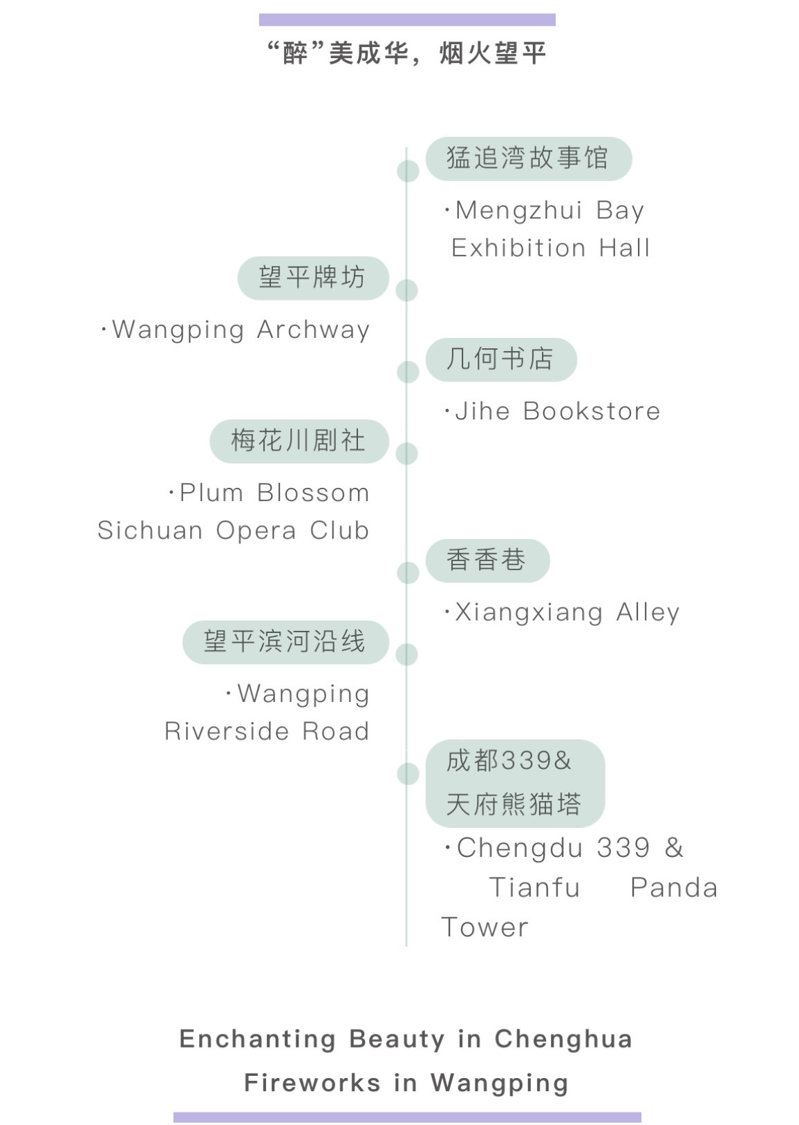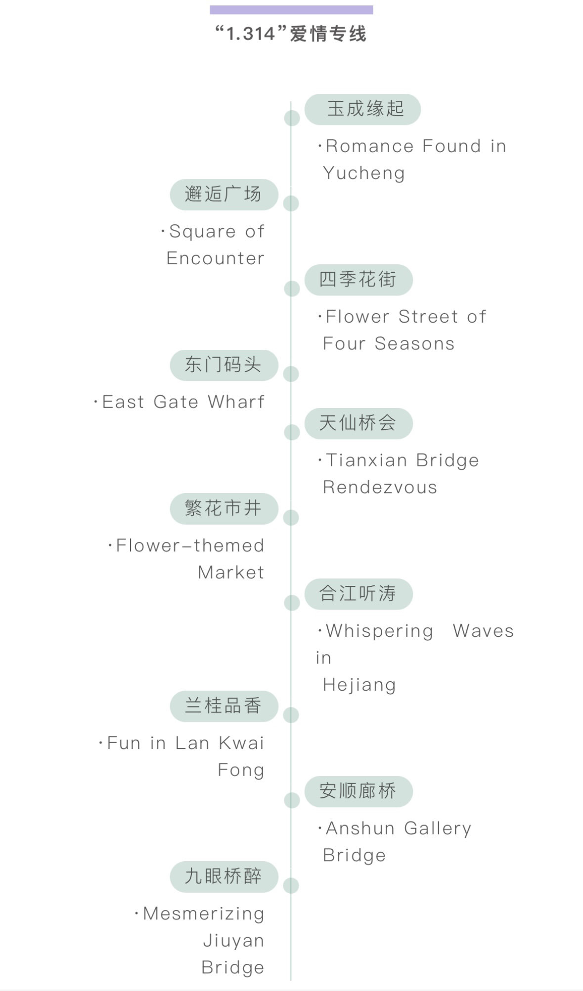 以爱情为主题,鲜花为主线,以合江亭、爱情斑马线为主IP,通过“点、线、面”进行有机串联,连接成都太古里、东门码头、合江亭、九眼桥等标志性地点,策划打造了“玉成缘起”“邂逅广场”等十个核心节点。营造了漫步式、社交化的空间形态,带动了天仙桥滨河路、大川巷、黄伞巷等六条子街巷有机更新,全力打造了实施幸福美好生活十大工程的锦江新样板。