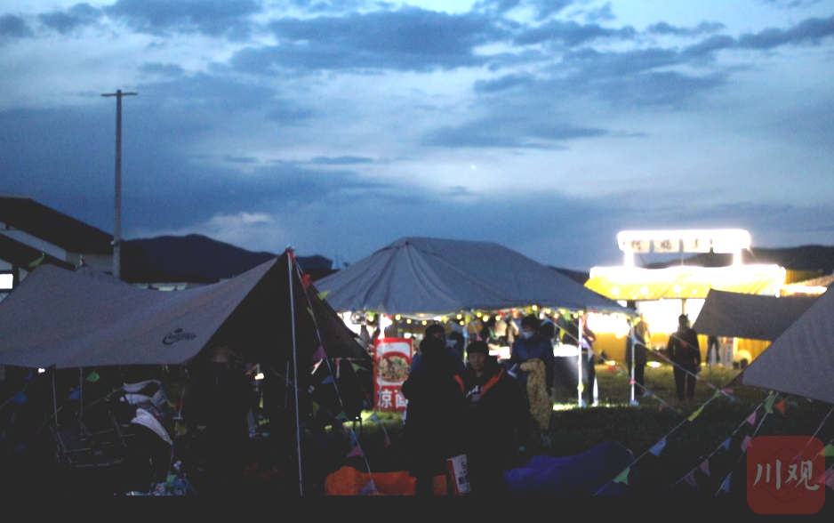 游客们穿梭在夜空下的帐篷群中