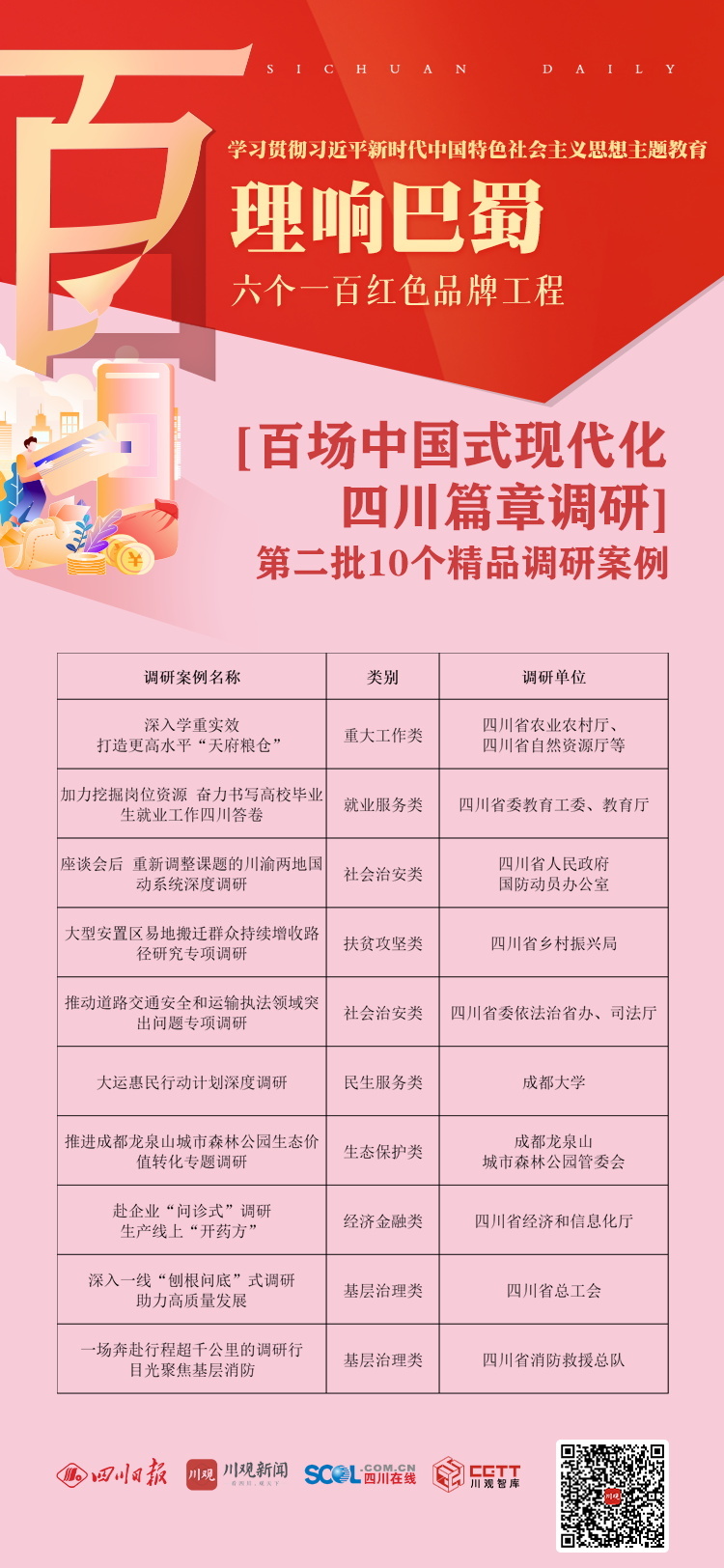 为推动学习贯彻习近平新时代中国特色社会主义思想主题教育往深里走、往实里走,由省委宣传部、省委教育工委指导,四川日报报业集团联合多方主办的活动——“理响巴蜀·六个一百”红色品牌工程,今日推出“百场中国式现代化四川篇章调研”系列第二批10个精品调研案例。