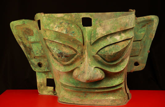 2021年三星堆遗址祭祀区3号坑出土。宽131厘米、高71厘米、深66厘米,保存较为完整,是三星堆迄今出土的最大青铜面具。其面庞夸张,棱角分明,线条流畅,宽颐、广额、粗横眉作扬起状、蒜头鼻、阔口、长耳,耳廓较宽,耳垂有一圆孔。面具的两侧上下及额部中间有方形穿孔,可能是用于固定用途。