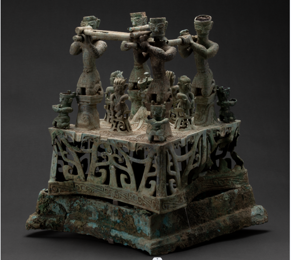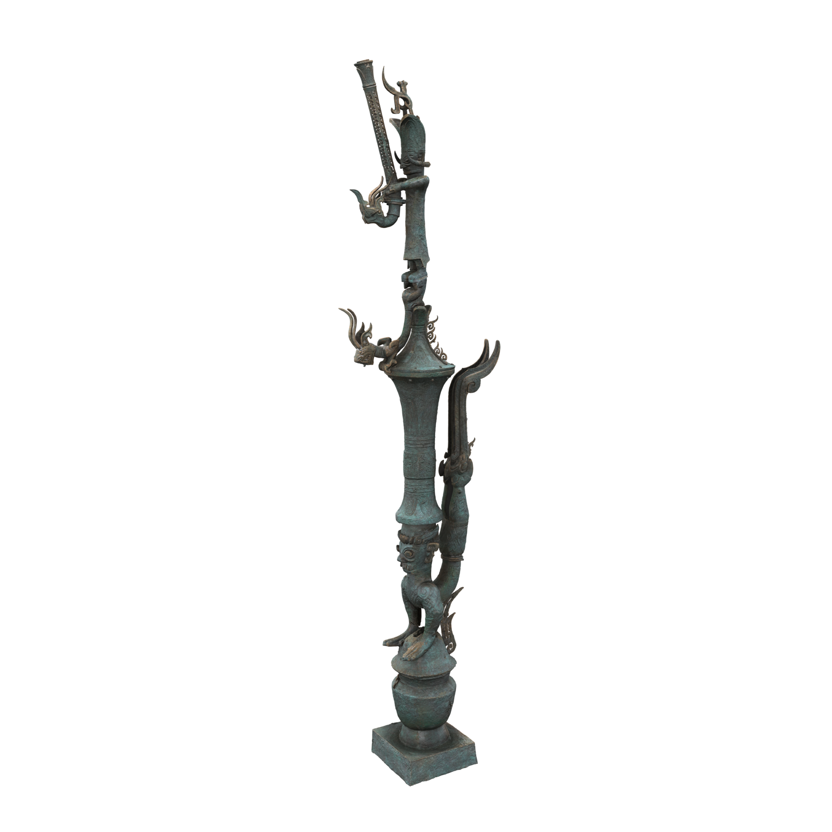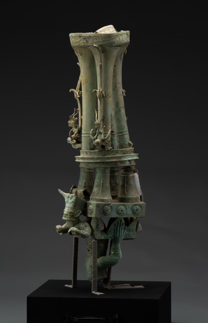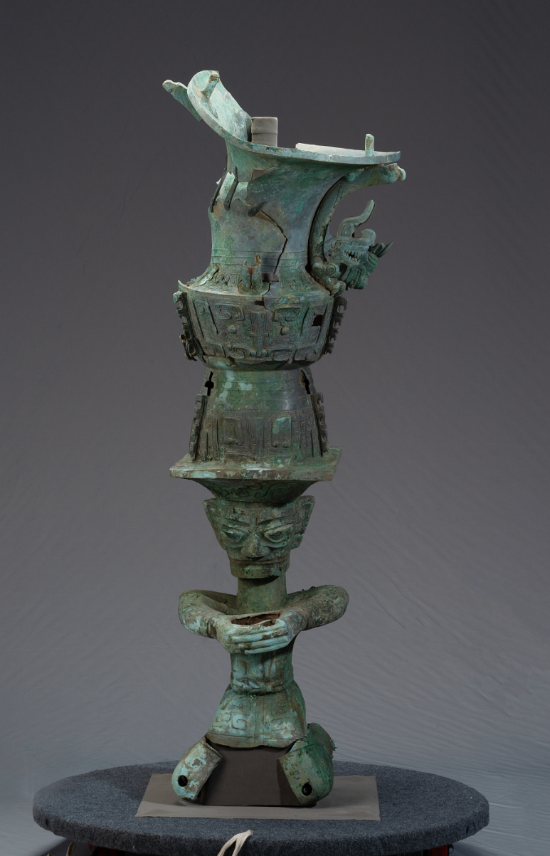 通高2.53米,由三星堆遗址祭祀区8号坑出土的青铜顶尊神像、青铜持龙立人像、青铜杖形器,三号祭祀坑出土的青铜罍、青铜龙形尊盖,二号祭祀坑出土的青铜鸟足人像拼合而成。文物尚未修复,目前分开展陈。