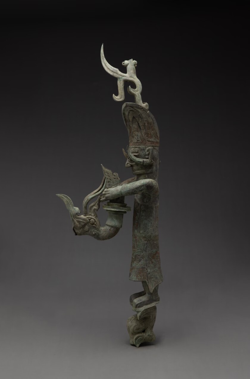 青铜鸟足神像青铜骑兽顶尊人像上端的持龙立人像