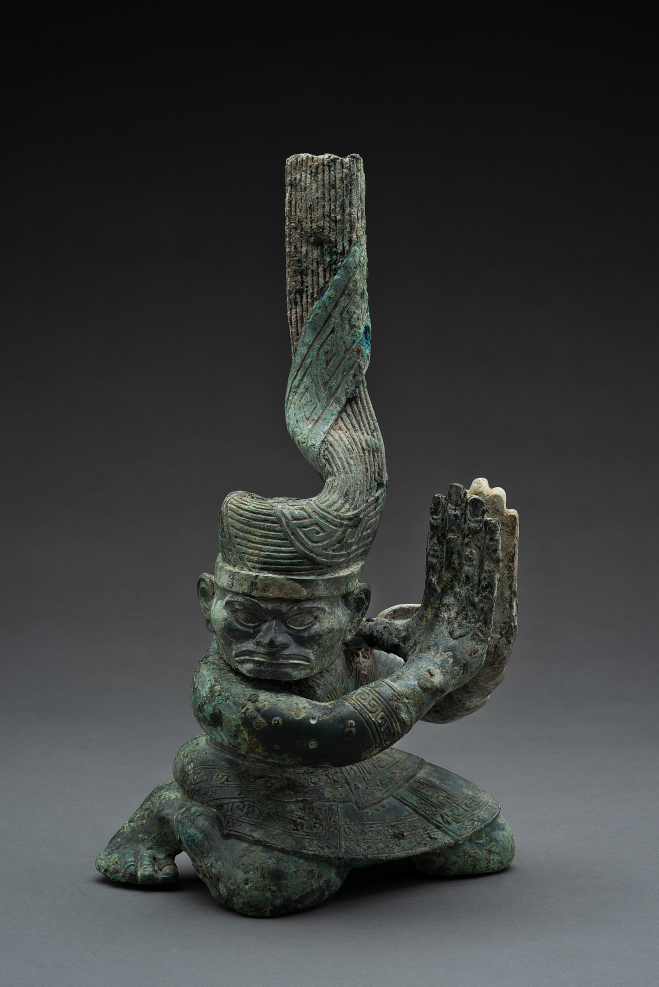 2021年9月三星堆遗址祭祀区4号坑出土。人像呈跪坐姿态,身体略向左前方倾斜,头微颔并扭向身体右侧,眉头紧锁,双颊肌肉紧绷,嘴唇微抿。头顶盘发一周并从左侧束发呈笔直之势立梳,另有一股头发下垂至左后肩。双手呈半“合十”状平举于身体左前方,两膝贴地,双脚前脚掌着地,后脚掌抬起,人像身体重心在左肩与双手掌之间卡槽的位置,整体显示出强烈的负重感。这件人像造型生动、风格写实、纹饰丰富,堪称同时代青铜馆造像的精品,代表三星堆铸造艺术的最高水平。