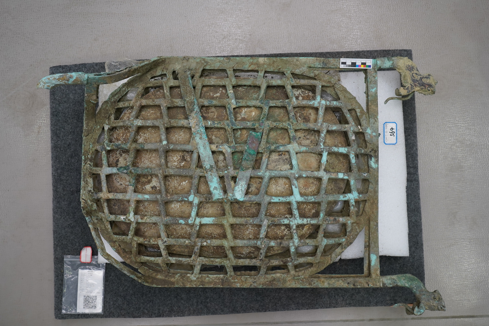三星堆遗址祭祀区7号坑出土。青铜龟背形网格形器呈长方形,上下对称,中间为椭圆形,中部隆起,周边为矩形边框,四角向外伸出龙头。青铜网格之中装有一块磨制精致的椭圆形青绿色玉器,上下对称呈弧背状。青铜网格及玉器表面均有大量纺织物残余。两条青铜条带穿过网格和玉器。此器造型独特,前所未见,功能尚不明确。