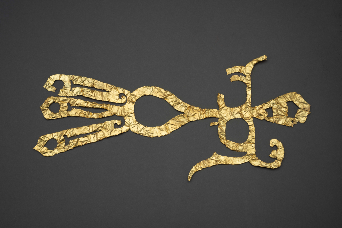 年代在商代后期,2021年三星堆遗址祭祀区5号坑出土。出土时拧成一团,经清理、展开成现貌,保存较完整。整体似一只鸟,橄榄形鸟首有两孔,双翅向两侧展开,以云纹为基础形状,其中一翅局部残缺,水滴形身,后接三尾羽。类似器物此前未见,推设为附着在诸如衣服类表面起装饰作用。