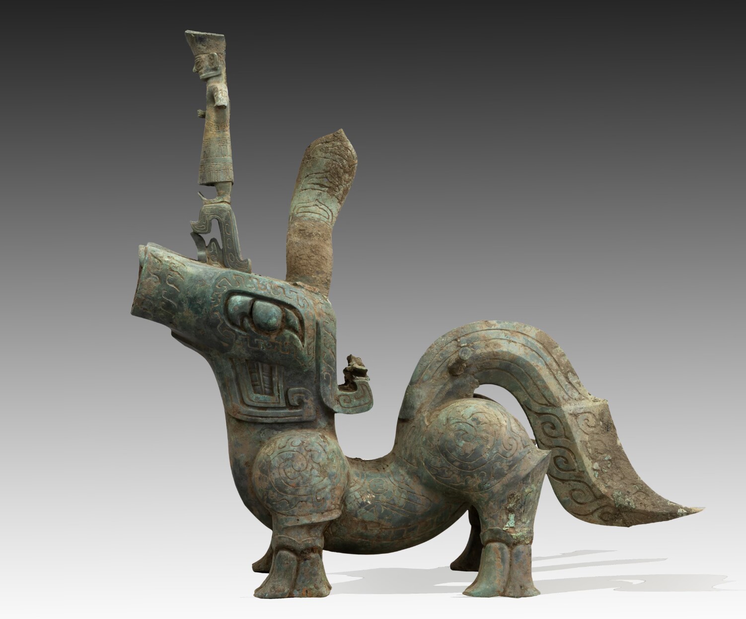 这件大型青铜立人神兽,是目前三星堆发现的最大的一件完整造型的动物形青铜器,它结构复杂、工艺精巧,其造型显示出了古蜀人天马行空般绚烂的想象力与创造力,堪称三星堆文明又一件震惊世界的瑰宝。