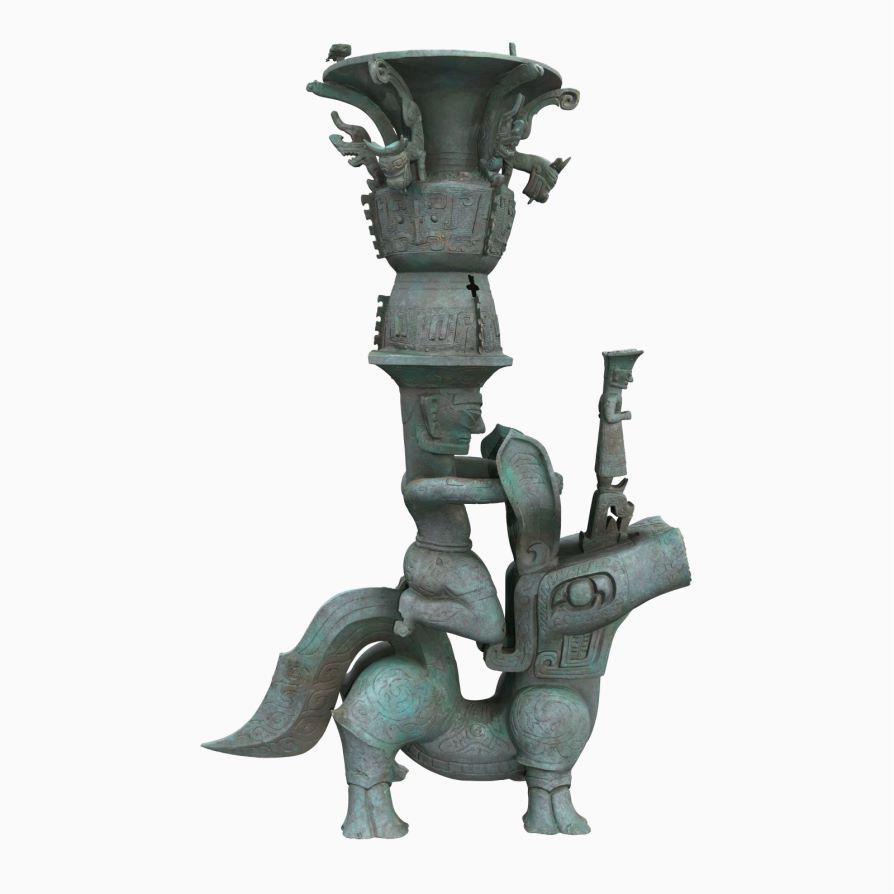 通高约159厘米。由三星堆遗址祭祀区8号、3号、2号坑出土的青铜神兽、青铜骑姿顶尊人像、青铜尊口沿拼合而成。目前展厅中这件文物部件分开展陈,由3D打印的合体文物供大家感受原本的风采。