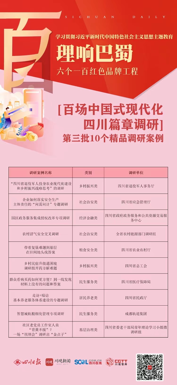 为推动学习贯彻习近平新时代中国特色社会主义思想主题教育往深里走、往实里走,由省委宣传部、省委教育工委指导,四川日报报业集团联合多方主办的活动——“理响巴蜀·六个一百”红色品牌工程,今日推出“百场中国式现代化四川篇章调研”系列第三批10个精品调研案例。