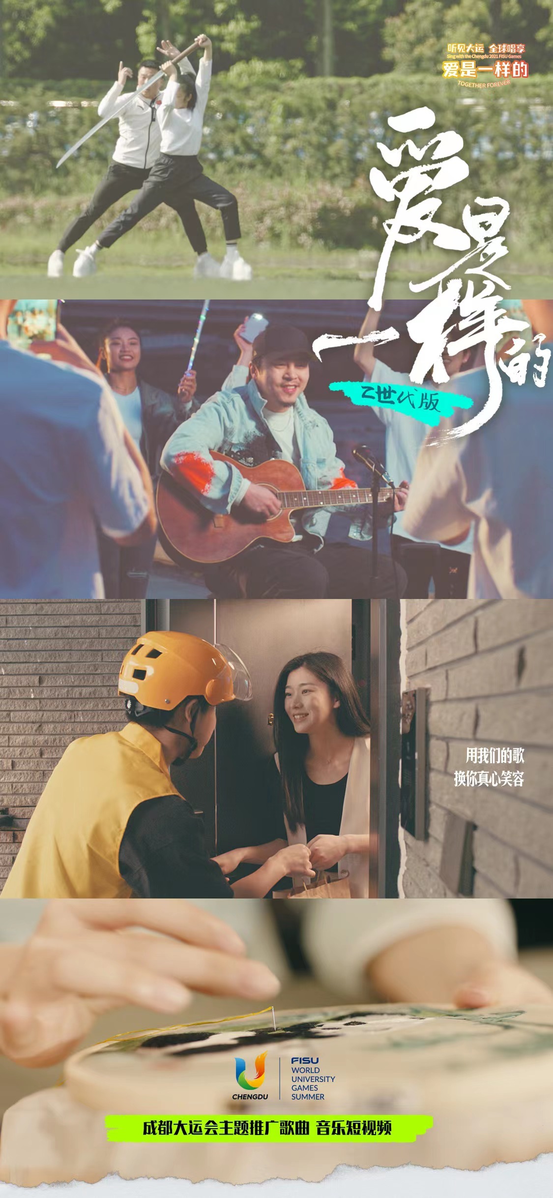 在成都大运会20首主题推广曲中,《爱是一样的》是最受观众喜爱、传唱度最高的歌曲之一。这首歌由2008年北京奥运会《北京欢迎你》《We are Ready》等歌曲的词曲音乐人常石磊和王平久制作,由张杰、张靓颖两位极具知名度的川籍歌手演唱。