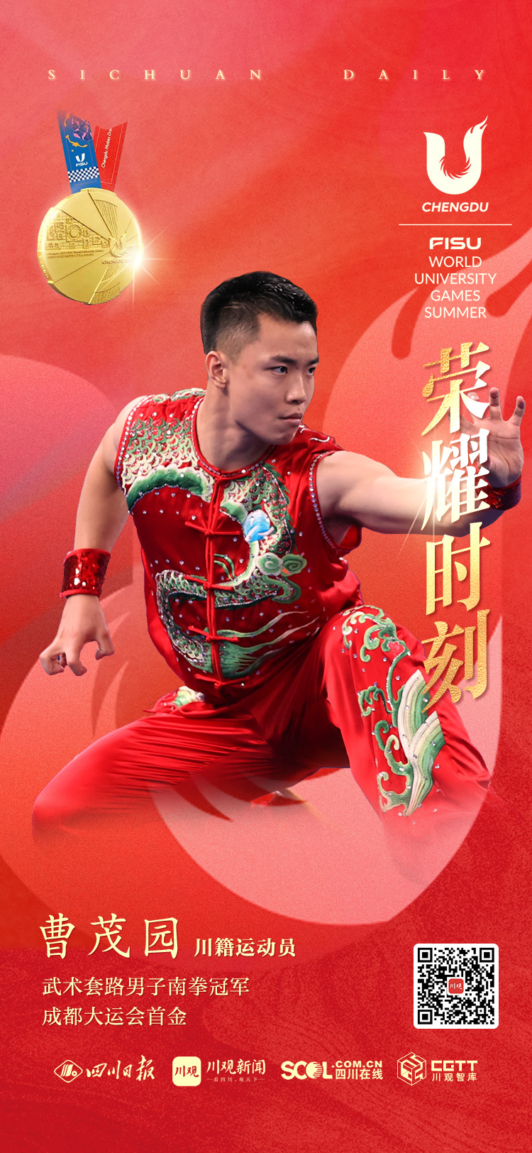 7月29日,成都第31届世界大学生夏季运动会武术比赛迎来第一个比赛项目,这也是武术项目第二次出现在大运会的赛场之上。来自四川内江的曹茂园在男子南拳比赛中以9.770分获得这个项目的金牌,这不仅是本届成都大运会产生的第一枚金牌,同时也是中国体育代表团在本届成都大运会上拿到的第一枚金牌。