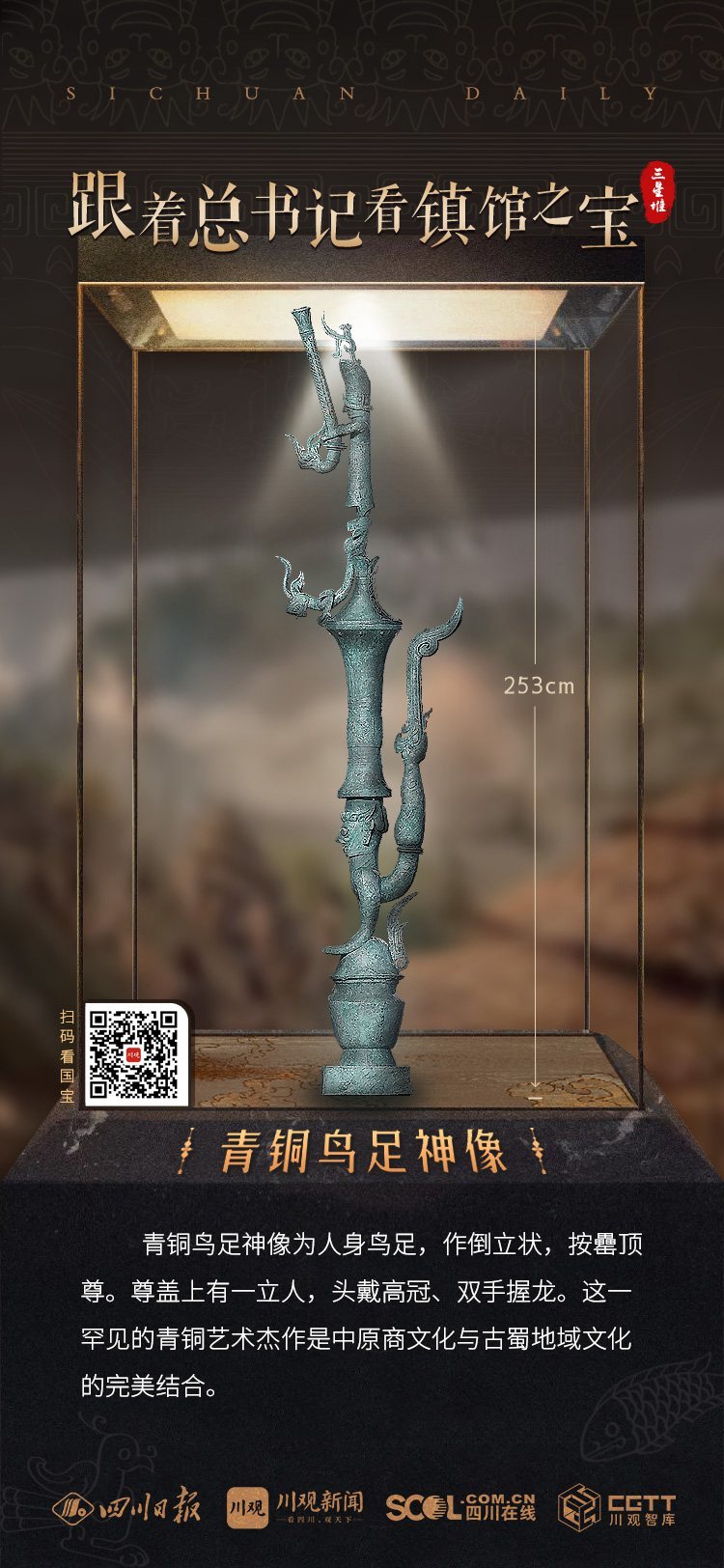 青铜鸟足神像为人身鸟足,作倒立状,按罍顶尊。尊盖上有一立人,头戴高冠、双手握龙。这一罕见的青铜艺术杰作是中原商文化与古蜀地域文化的完美结合。