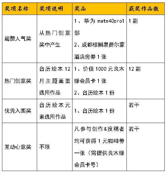 2020年,我们一起经历了各种考验和磨难,对美好生活的向往更加强烈。即日起,川观新闻联合良木缘,启动2021美好生活向往节——手绘台历创意征集活动。活动不设门槛,只要你喜欢创作,就能参加我们的活动。网友可通过活动官方渠道川观新闻APP、良木缘微信公众号“良木缘GOODWOOD”上传作品,也可以将作品上传新浪微博并@良木缘咖啡官方账号参与活动。您就有机会将自己的画作、诗词、金句印制在我们的成都美好生活宝藏书上,最优秀的作品还能获得万元大奖。