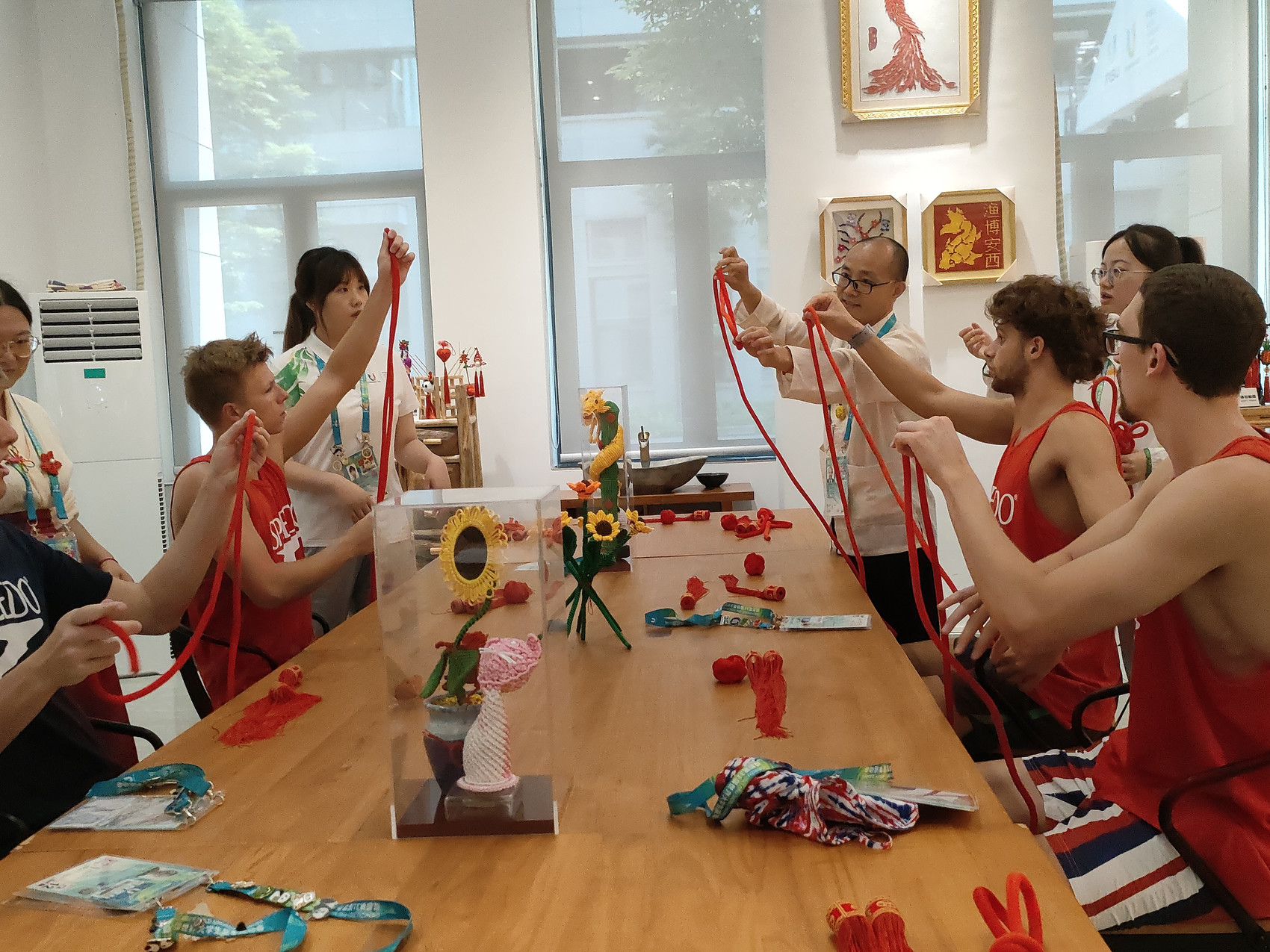 “我们给运动员们准备的体验项目是‘吉祥如意结’,每一场的项目体验时间是半小时,大家做完就可以当成纪念品带走,把这份美好祝愿带回去。”杨文艺从事绳编已经四十多年,这是他第一次面向这么多外国朋友推介新津非遗文化。来自美国、新西兰、芬兰、阿根廷、埃塞俄比亚等国家和地区的运动员们都兴致勃勃地参与其中,随着杨文艺的教学,结绳成结,人人都是巧手。