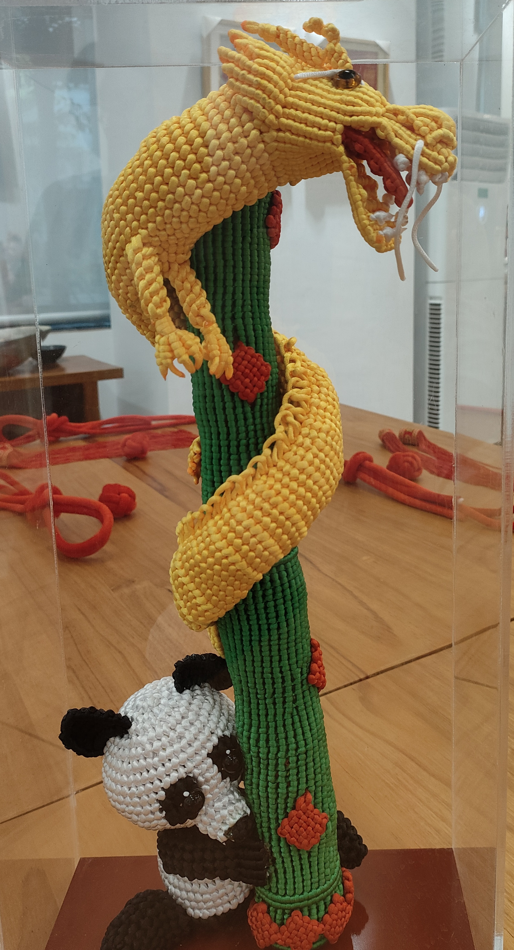 杨文艺团队为大运会特别准备了图腾绳结作品,由熊猫、竹子和龙三种元素构成,有七八十厘米高,耗时两个月编制完成。杨文艺介绍,新津绳编的独特之处在于它的工艺繁复,需要精湛的技艺和极大的耐心。在创作过程中,编者需要根据自己的经验和灵感,将一根根的绳子编织成一幅幅美丽的作品。