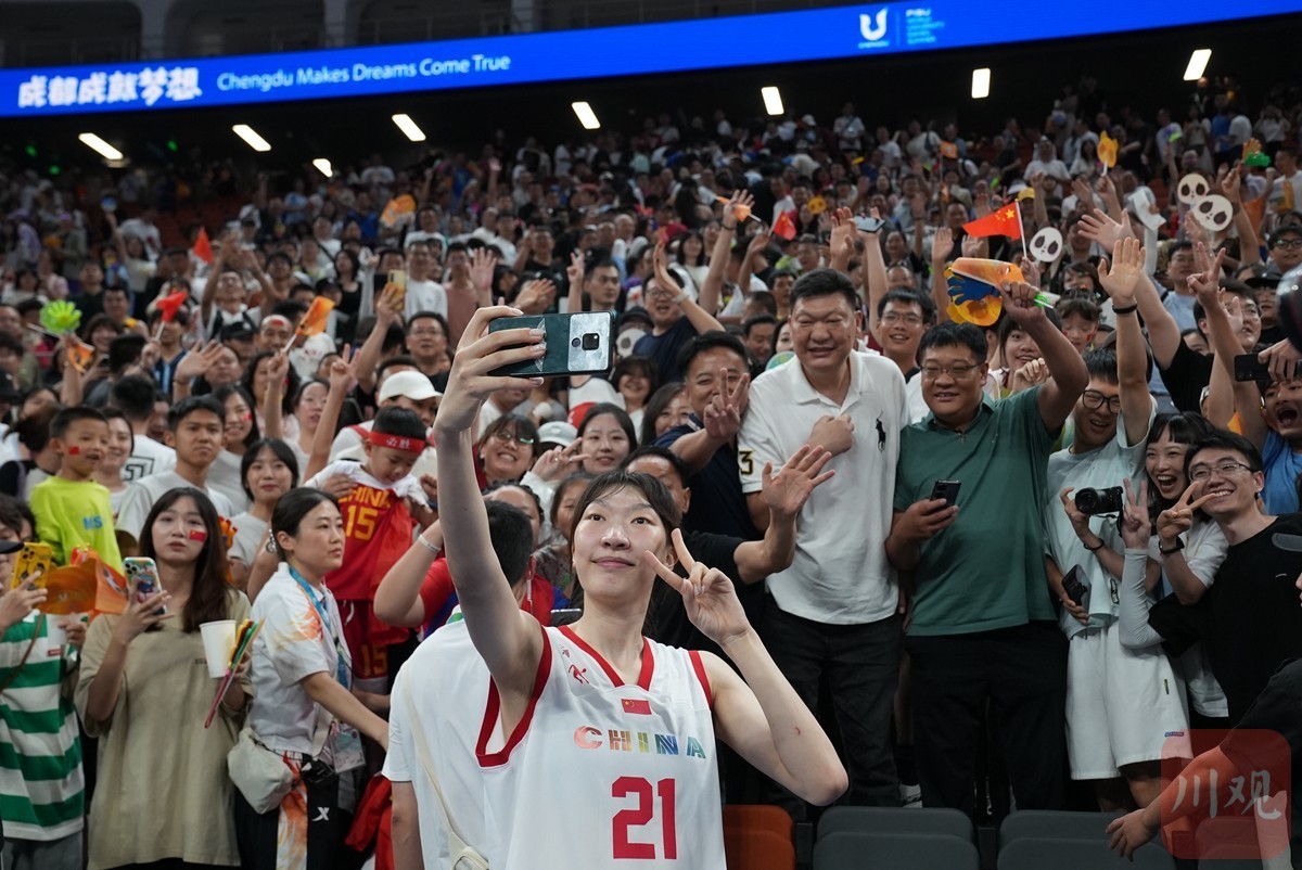 赛后,中国女篮中锋韩旭与观众自拍互动