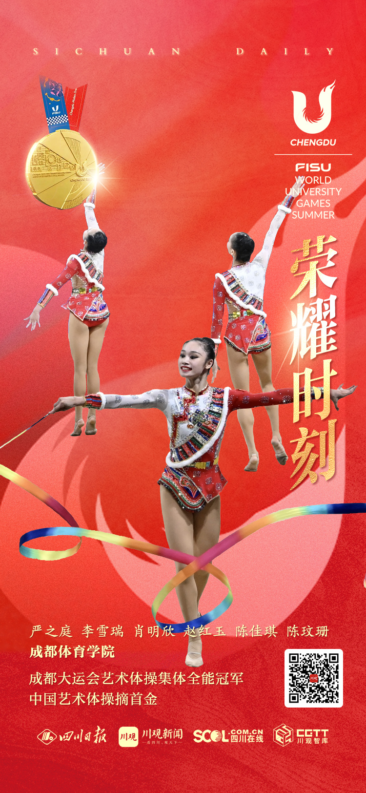 7月30日,成都第31届世界大学生夏季运动会艺术体操项目迎来了第二个比赛日,在艺术体操集体全能项目的比赛中,中国队以57.150分的总成绩夺得金牌,这也是本届大运会中国艺术体操斩获的第一块金牌。