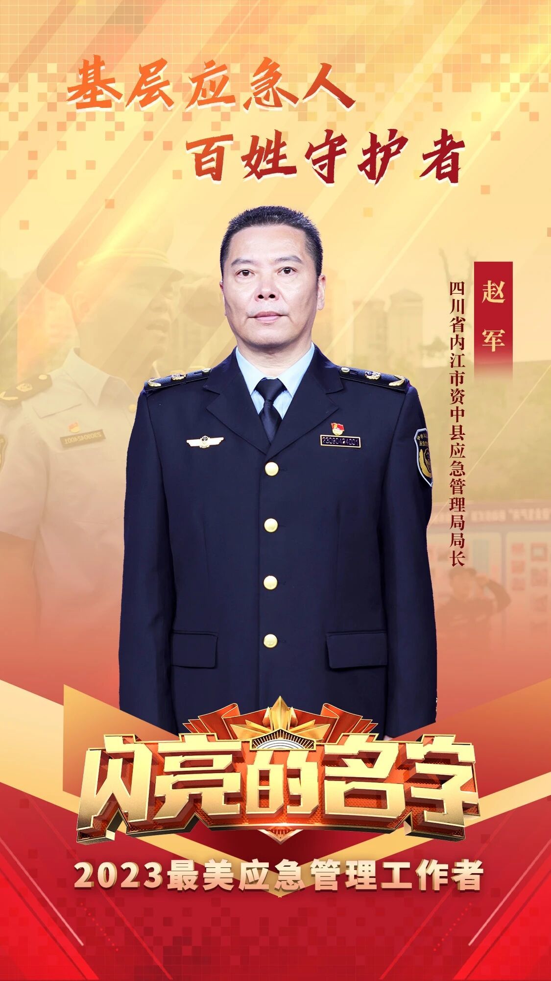 7月30日晚,中共中央宣传部、应急管理部联合发布了2023年“最美应急管理工作者”,四川省内江市资中县应急管理局局长赵军被授予殊荣。