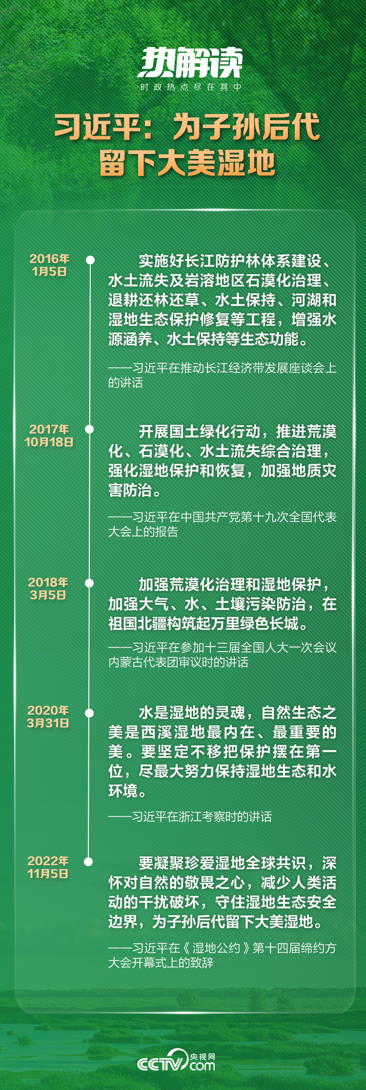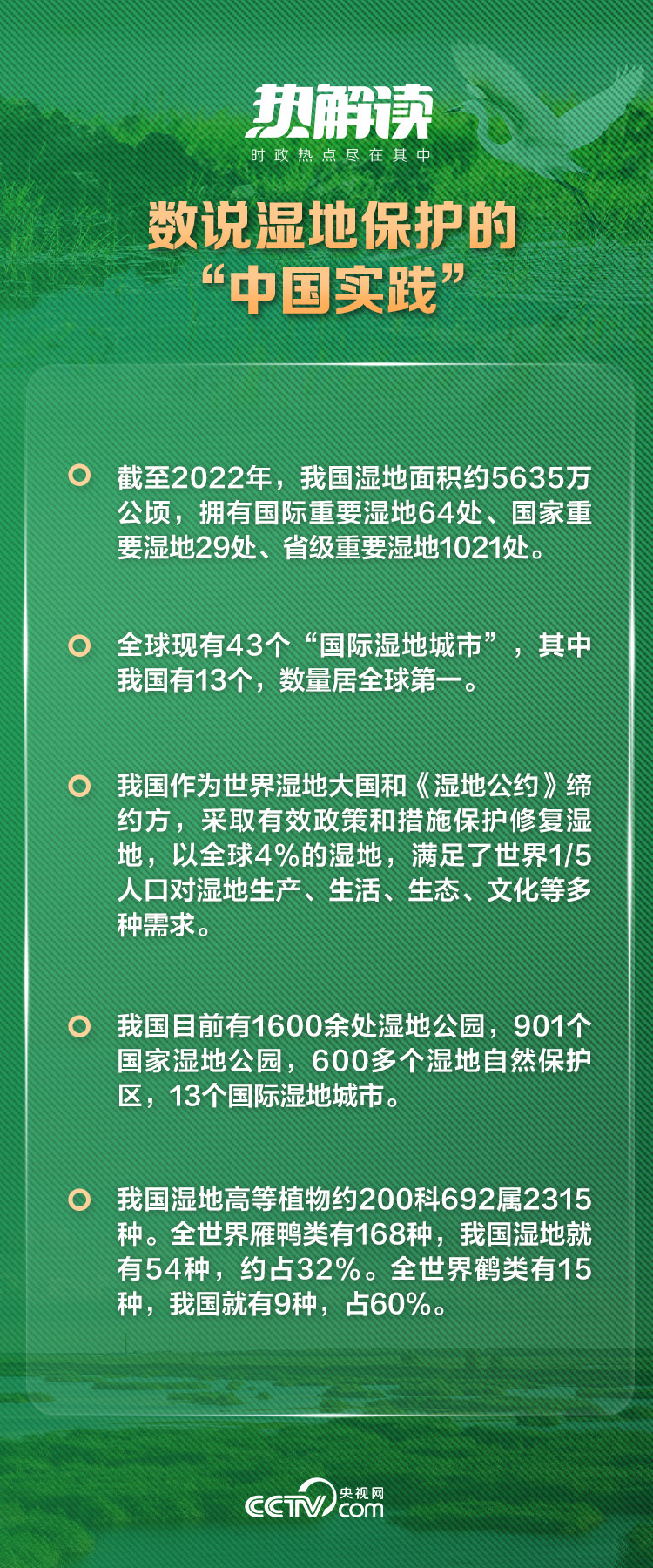 有理念,更有行动。2022年11月,习近平主席在《湿地公约》第十四届缔约方大会开幕式上发表致辞时提出,“中国将陆续设立一批国家公园,约占陆域国土面积的10%,把约1100万公顷湿地纳入国家公园体系,重点建设三江源、青海湖、若尔盖、黄河口、辽河口、松嫩鹤乡等湿地类型国家公园,实施全国湿地保护规划和湿地保护重大工程”。面向全球,中国将落实推动国际交流合作、保护4条途经中国的候鸟迁飞通道、在深圳建立“国际红树林中心”、支持举办全球滨海论坛会议等一系列务实举措。