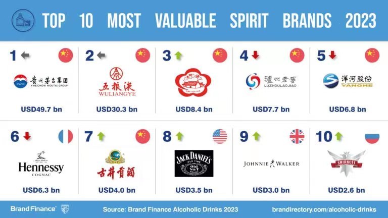7月28日,英国品牌评估咨询公司 “品牌金融”(Brand Finance)发布《Brand Finance 2023年全球最具价值酒类品牌榜单报告》(以下简称《报告》),榜单包含全球烈酒榜50强、全球啤酒榜50强、全球红酒榜15强。其中,茅台、五粮液、杏花村汾酒、泸州老窖和洋河跻身《2023年全球最具价值烈酒品牌榜》全球前5强,古井贡酒位列第7,由此可见中国白酒在世界烈酒行业中的影响力与日俱增。