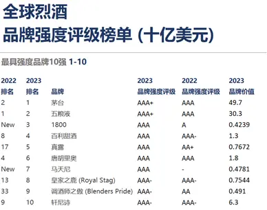 值得一提的是,在品牌强度评级中,茅台与五粮液成为《2023年全球最具价值烈酒品牌榜》中仅有的两个AAA+品牌强度评级。其中,茅台的品牌实力指数(BSI)为90.8分(满分100分),五粮液紧随其后达89.8分。