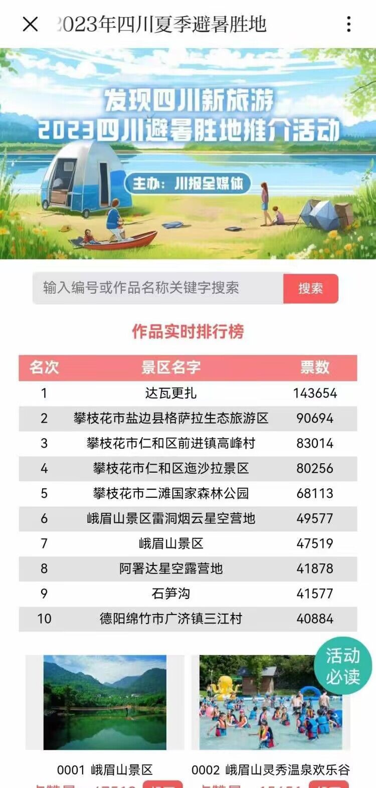 暑期过半,高温的8月,是时候来一场说(bi)走(shu)就(cheng)走(liang)+薅羊毛的旅行了。盛夏出游,清凉何处寻? “发现四川新旅游·2023四川避暑胜地推介活动”给你参考!截至8月1日10时,最受网友喜爱的避暑地投票中,既有老牌的川内旅游名牌,也有新晋的旅游景区,有好耍好玩的清凉地,也有亲近大自然的森林绿地。