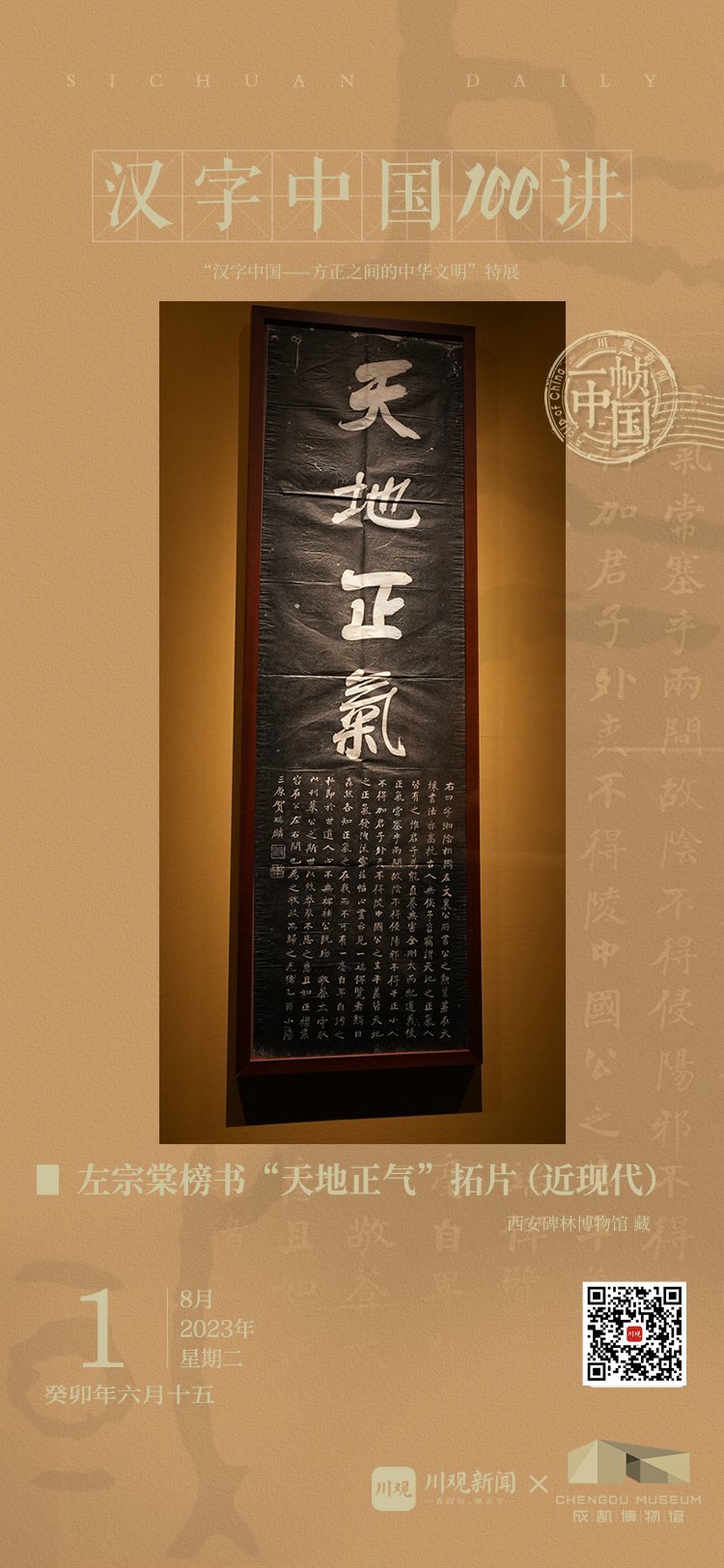 今天为大家介绍的这件文物,是晚清名臣左宗棠书“天地正气”拓片。其中,“天地正气”四个字取自文天祥《正气歌》中的“天地有正气,杂然赋流形”。左宗棠为官期间,关注民生、巩固边疆,整饬吏治,表现出端正的人品和豪迈的气度。他书写的“天地正气”四个大字颇见功力,用笔坚实而自如,宗法晋唐,有傲岸之气。左宗棠行书出柳公权,而稍参欧阳询,此碑肃括森立,劲中见厚。左宗棠本人“天地正气”的家国情怀,对后世影响颇为深远。