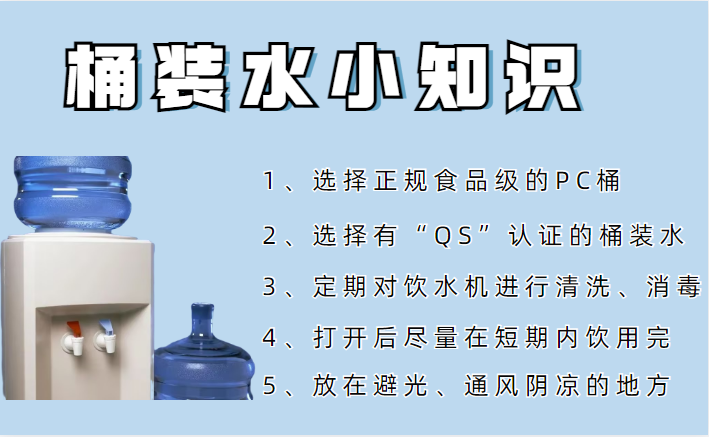 在购买桶装水时水桶的质量问题很容易被忽略,目前只有食品级全新材料PC(聚碳酸酯)桶是国家标准中唯一允许使用的。在购买桶装水时,应首先看桶的包装外观。正规食品级的PC桶透明光滑,呈均匀、纯正淡蓝色,且无杂质、无斑点、无气泡,质感硬,手指轻拍桶壁声音清脆且有韧性。另外,还要注意查看水桶上的厂名、执行标准、生产日期及保质期等信息,要选择有“QS”认证的桶装水。