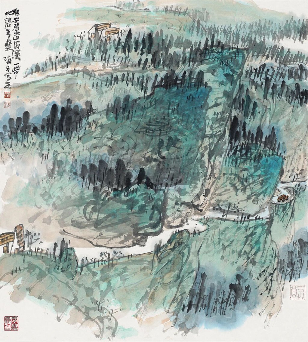 我省著名画家陈滞冬的彩墨山水,对传统中国画有突破性的发展,笔墨技巧和构图意境皆具新意;重彩的花鸟山水更是自创一格。传统山水画以用墨为主、用色为辅,色彩较为单调,陈滞冬这幅《苗溪道中》,则充分利用传统青绿山水画法的技法积累,开掘出更多的矿物颜料使用方法并扩大了使用范围,突破传统的用色习惯。在笔质的探索创新上,他的作品充分展示了线条排列组合和块面分割的形式美,具有较强的现代审美意识。细读其作品,每一幅都给人带来独特的美感,引动观者遐想并享受到蕴含其中的精神安慰。