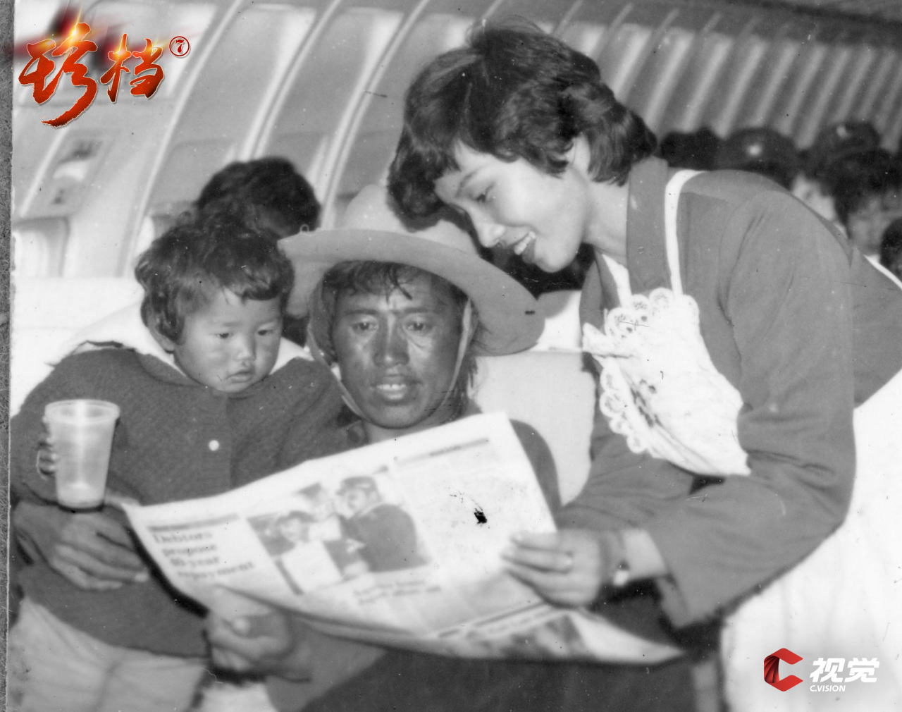 1989年,在拉萨飞往成都的航班上,乘务员热情地给旅客介绍成都的人文旅游。