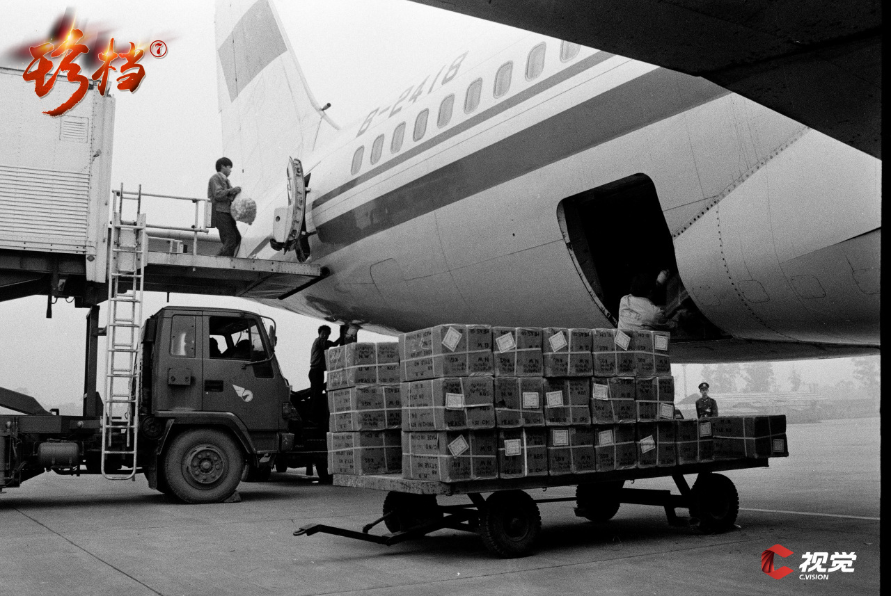 1989年,成都双流机场的货运员正在将货物搬运上飞机。