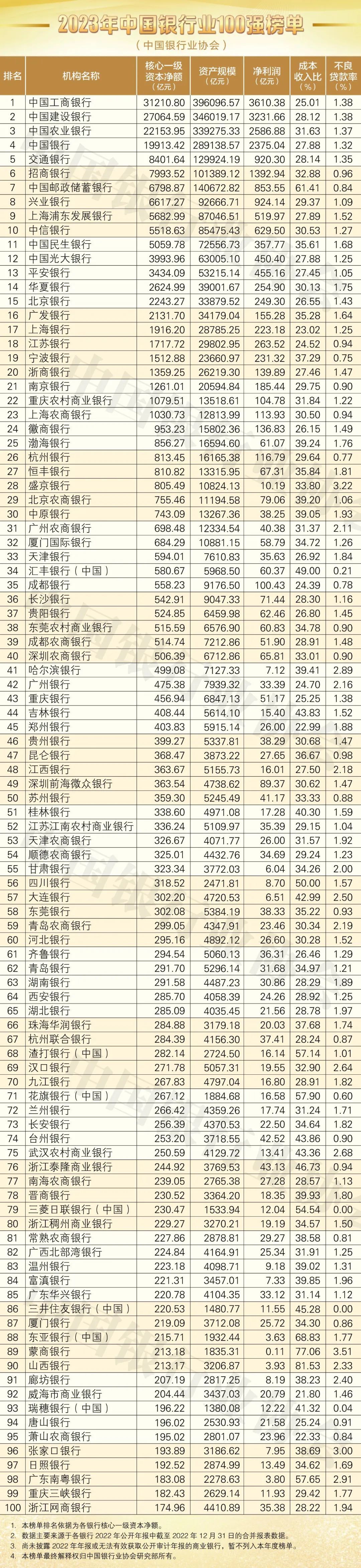 2023年中国银行业100强榜单。中国银行业协会 供图