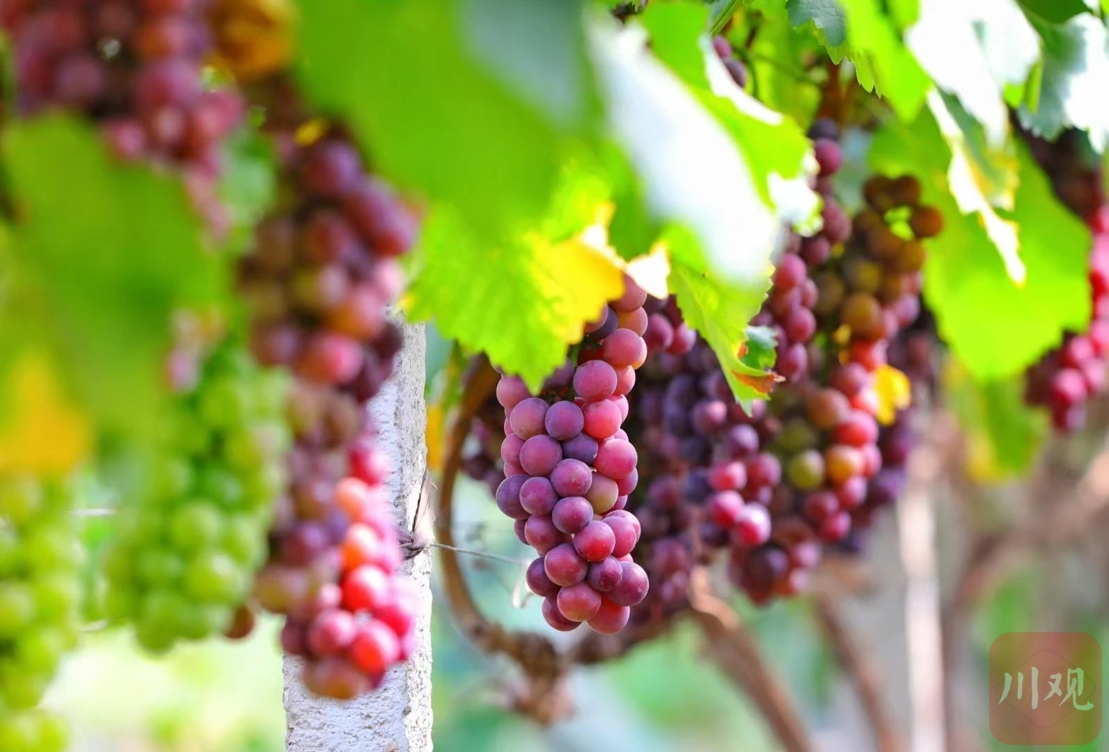 压架骈枝露颗圆,水精落落照晴轩。盛夏时节,走进葡萄大棚内,碧叶叠嶂,果香满园,一串串沉甸甸、晶莹剔透的葡萄挂满树藤。在翠屏区宗场镇彭一洲家庭农场内种植了30多亩葡萄,包括夏黑、红提、阳光玫瑰、水晶葡萄等8个品种,采摘期将持续到9月。