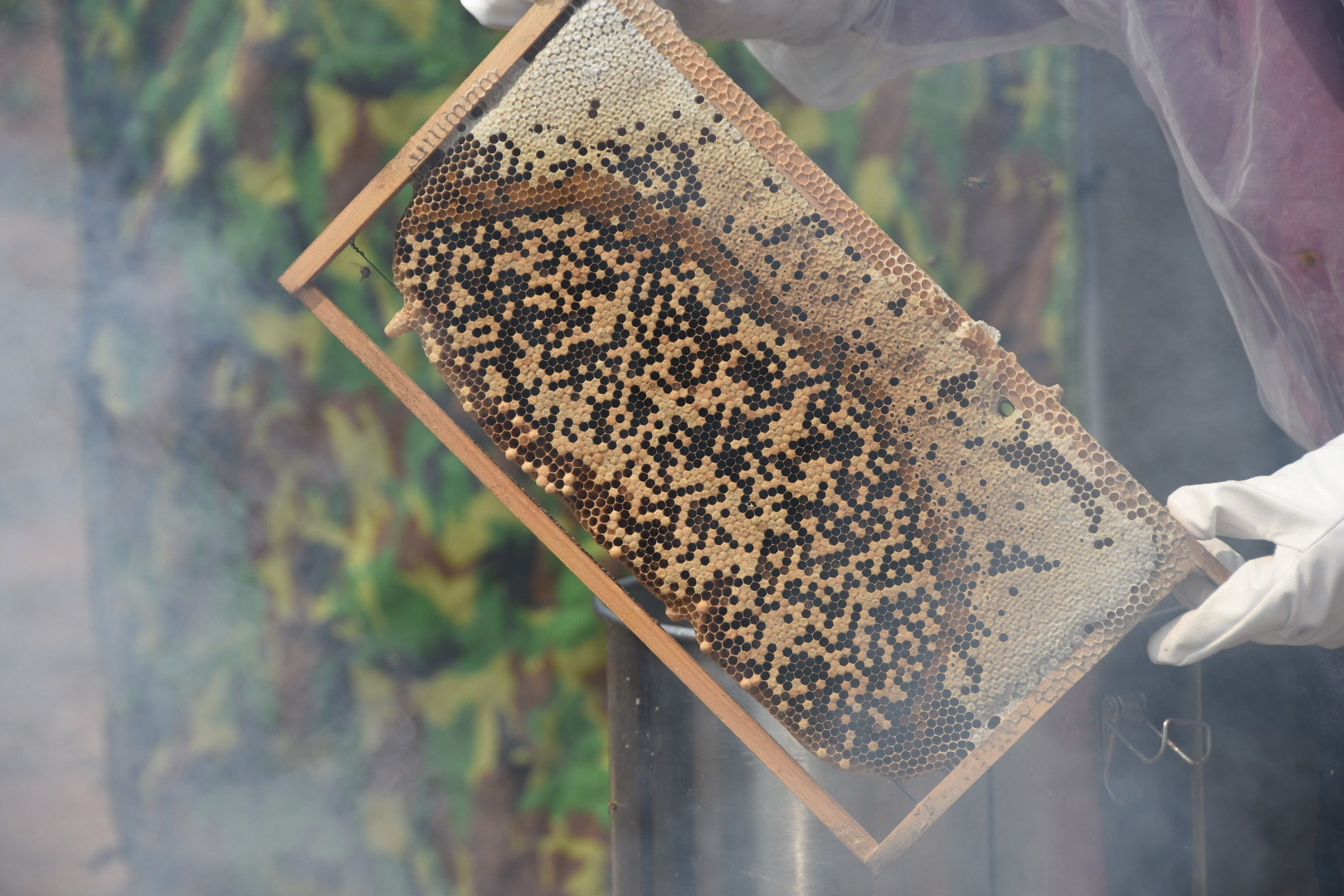 李九林是南部县双峰乡太子岛村飞凰养蜂农民专业合作社的负责人。山林里的养殖基地饲有他悉心照料的近百箱中华蜜蜂(下称“中蜂”)。恰逢南部县主要蜜源植物——荆条的盛花期,由于前期雨水较为充沛,蜜源植物长势良好,流蜜量大,当地部分蜂场已经进入生产高峰期。李九林当天的主要工作是摇取已经成熟的蜂蜜。