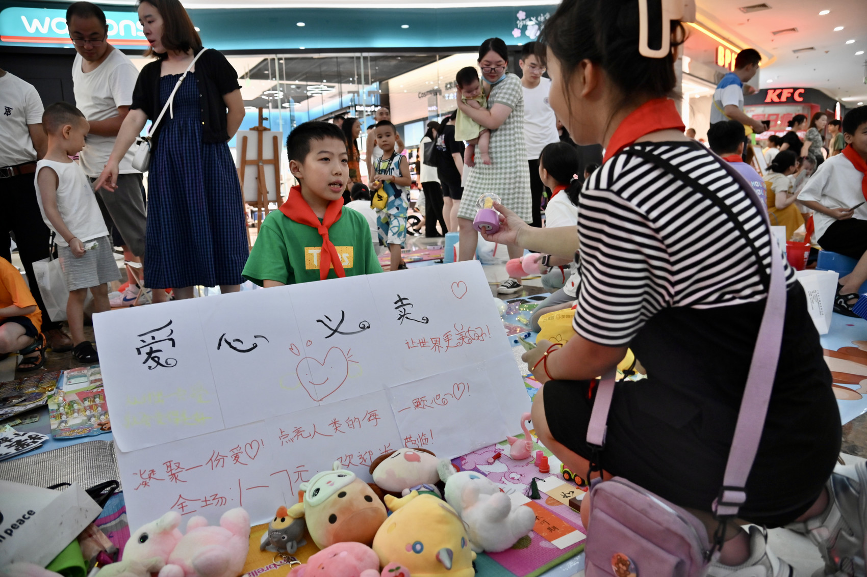 8月4日晚,内江万达广场、万晟汇、吾悦广场三地同时开展“红领巾星空集市”公益活动。“红领巾”们化身爱心集市摊主,用义卖的方式筹集善款献出自己的爱心。