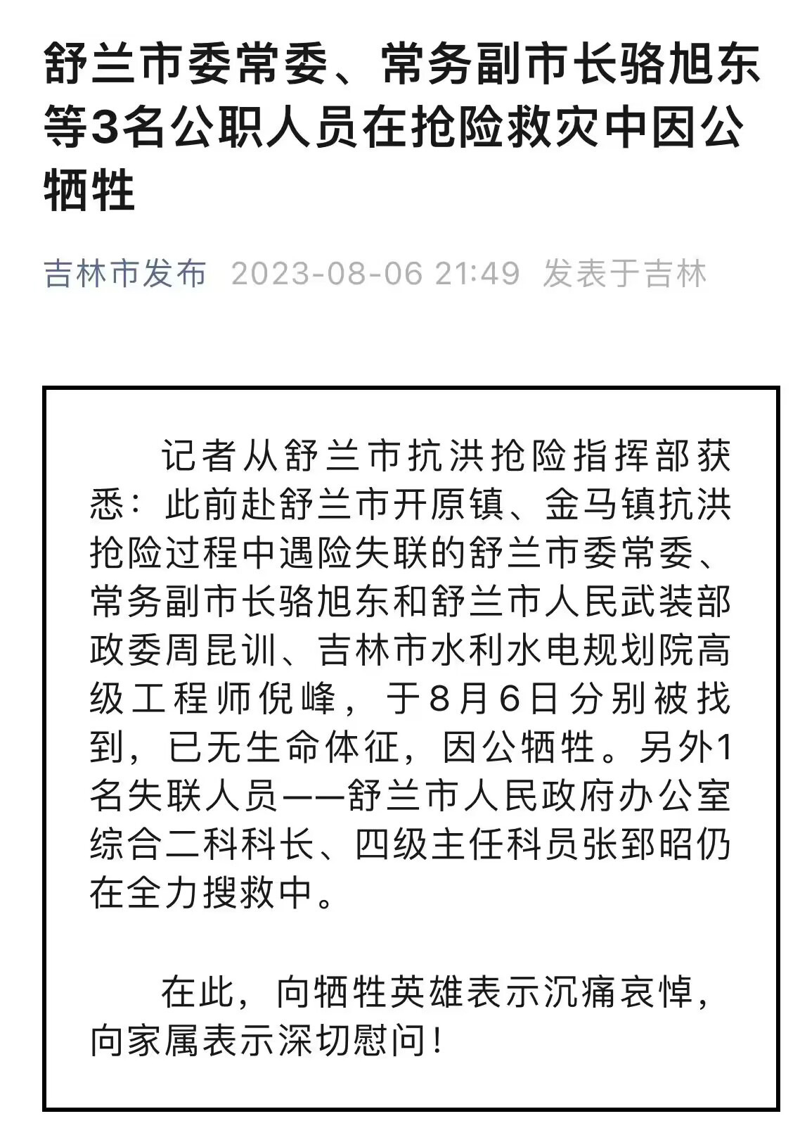 记者从舒兰市抗洪抢险指挥部获悉:此前在舒兰市开原镇、金马镇抗洪抢险过程中遇险失联的舒兰市委常委、常务副市长骆旭东和舒兰市人民武装部政委周昆训、吉林市水利水电规划院高级工程师倪峰,于8月6日分别被找到,已无生命体征,因公牺牲。另外1名失联人员——舒兰市人民政府办公室综合二科科长、四级主任科员张郅昭仍在全力搜救中。