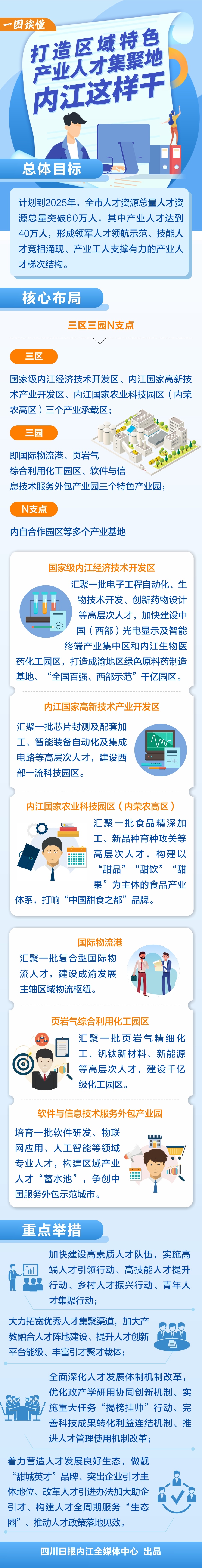 在重点举措上,内江将加快建设高素质人才队伍,实施高端人才引领行动、高技能人才提升行动、乡村人才振兴行动、青年人才集聚行动;大力拓宽优秀人才集聚渠道,加大产教融合人才阵地建设、提升人才创新平台能级、丰富引才聚才载体;全面深化人才发展体制机制改革,优化政产学研用协同创新机制、实施重大任务“揭榜挂帅”行动、完善科技成果转化利益连结机制、推进人才管理使用机制改革;着力营造人才发展良好生态,做靓“甜城英才”品牌、突出企业引才主体地位、改革人才引进办法加大助企引才、构建人才全周期服务“生态圈”、推动人才政策落地见效。