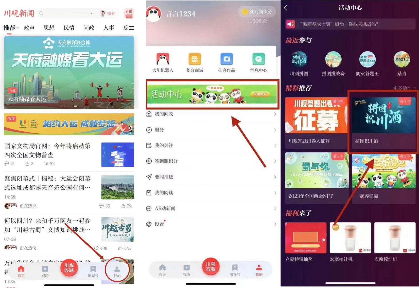 2、在川观新闻首页,点击“我的”—“活动中心”,找到“拼图识川酒”活动图片,点击即可参与。