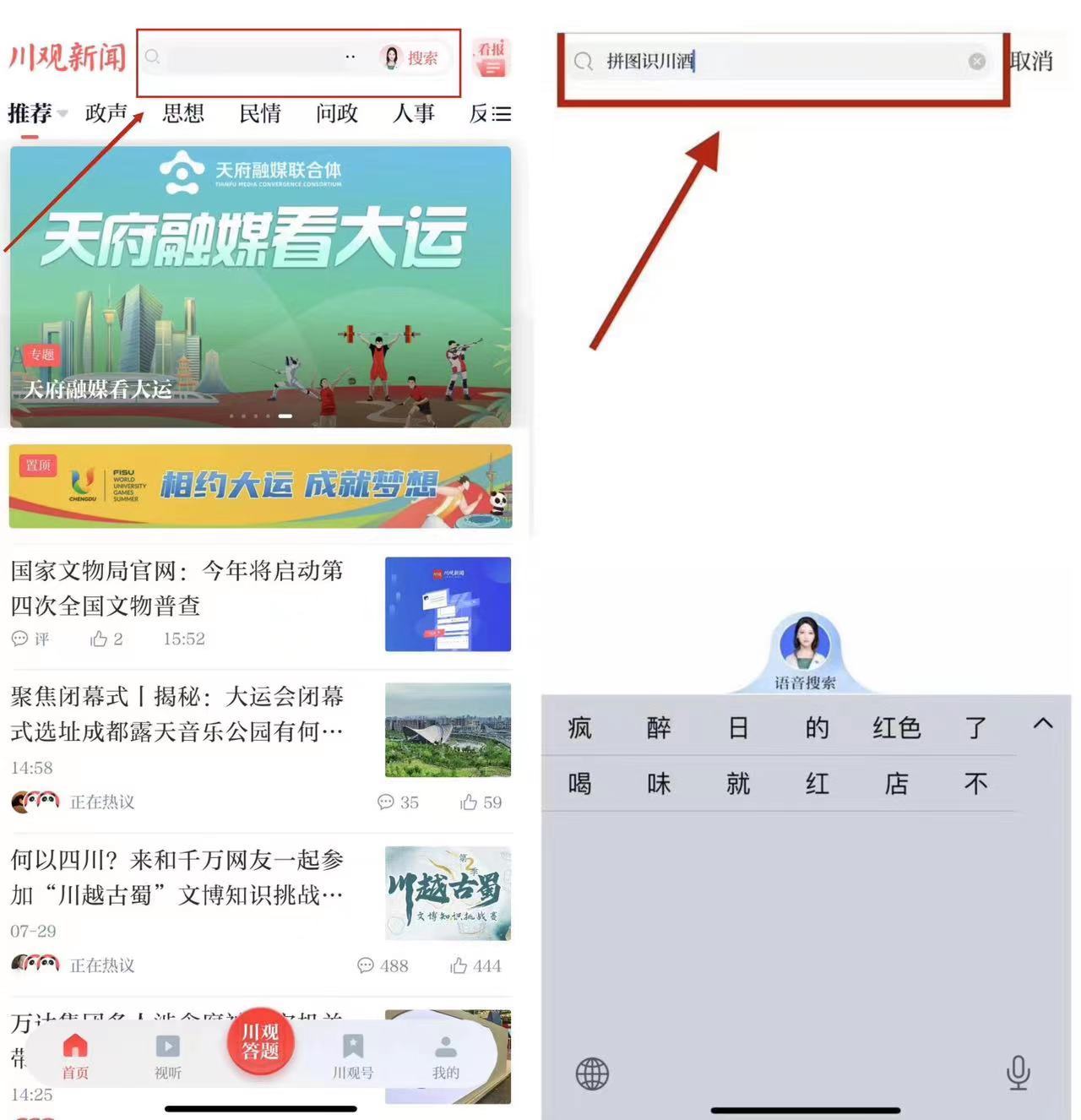 3、在川观新闻首页顶部搜索框输入“拼图识川酒”,点击活动链接即可参与。