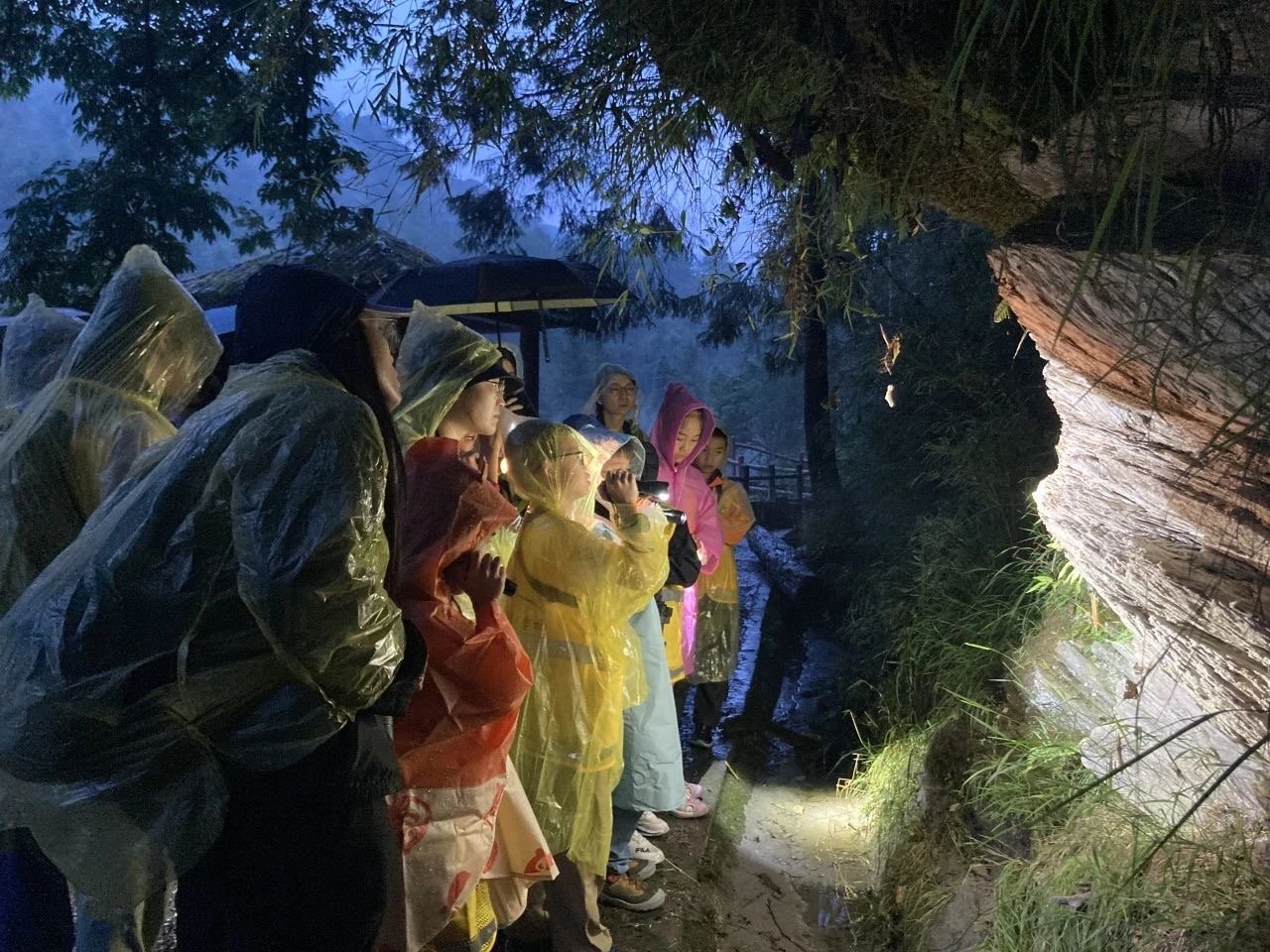 二郎山喇叭河景区和成都乡野走廊联合创办的喇叭河自然学校内,孩子们在雨夜中观察昆虫。 图据 乡野走廊
