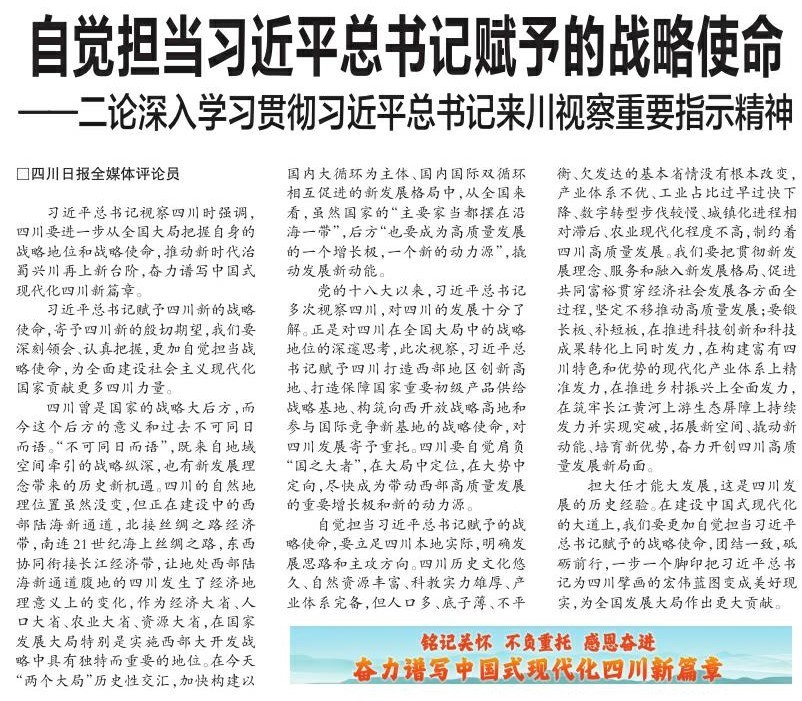 自觉担当习近平总书记赋予的战略使命 ——二论深入学习贯彻习近平总书记来川视察重要指示精神