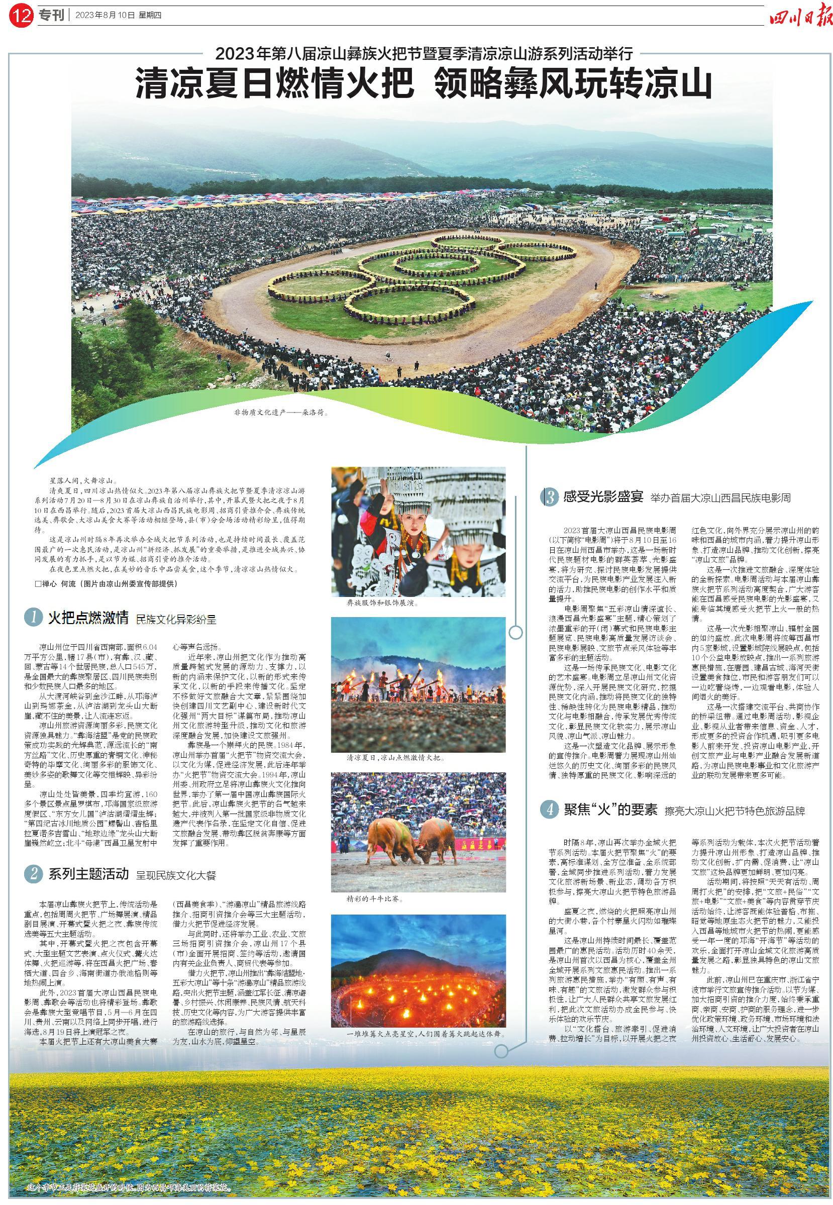 2023年第八届凉山彝族火把节暨夏季清凉凉山游系列活动7月20日—8月30日在凉山州举行,8月10日,将举行开幕式暨火把之夜活动。当天,四川日报刊发整版文章《清凉夏日燃情火把 领略彝风玩转凉山》,稿件从四个部分,聚焦火把节系列活动和首届大凉山西昌民族电影周等,多角度呈现凉山火把节系列活动这一文旅盛会,展现凉山文旅融合发展新路径。