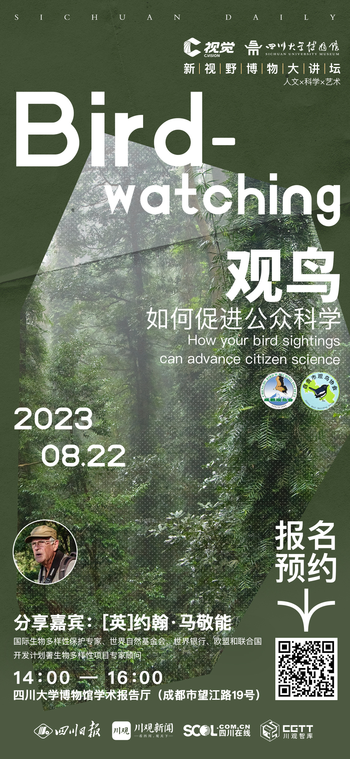 作为C视觉影像数据库今年推出的首场线下公开课,《约翰·马敬能成都说鸟——新视野博物大讲坛:观鸟如何促进公众科学》讲座无论是对于观鸟新手还是爱鸟达人,都将是一次难得的学习机会。心动不如行动!请感兴趣的市民和拍客扫描下方二维码报名,并持有四川大学博物馆入馆预约信息入场。报名截止时间:8月22日中午12点。