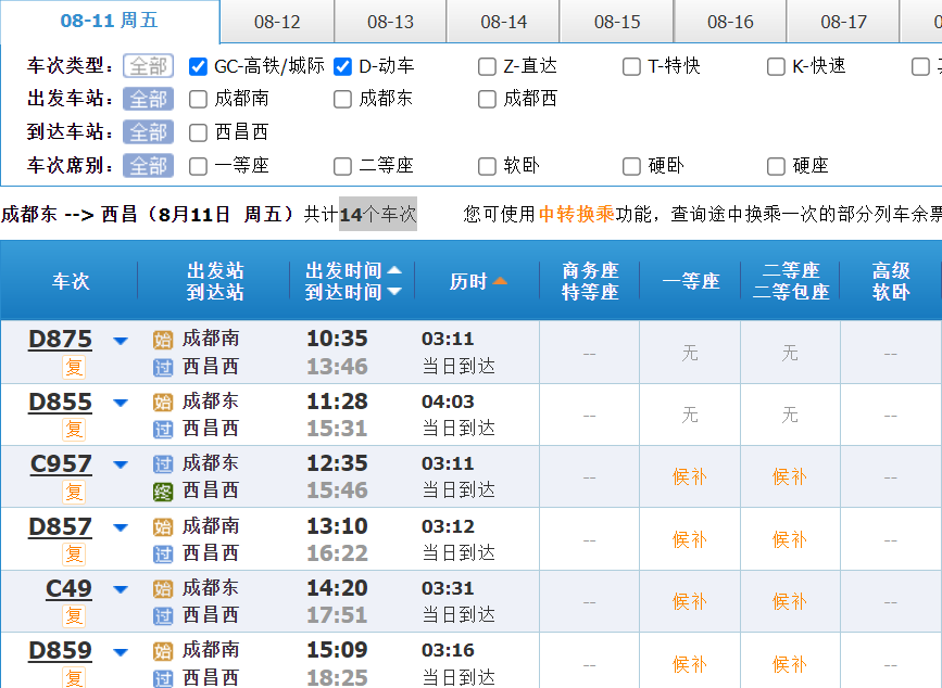 记者8月11日在中国铁路12306网站,搜索“成都东—西昌”的车票,发现当天14个车次全部显示为“候补”。从“成都东”至西安、北京、上海等多地也显示无票或需要候补。