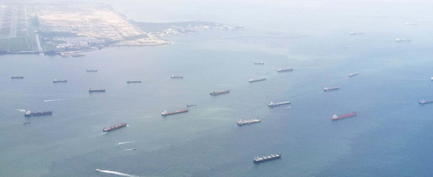 从空眺望,新加坡海峡海面上航行的船舶密密麻麻。